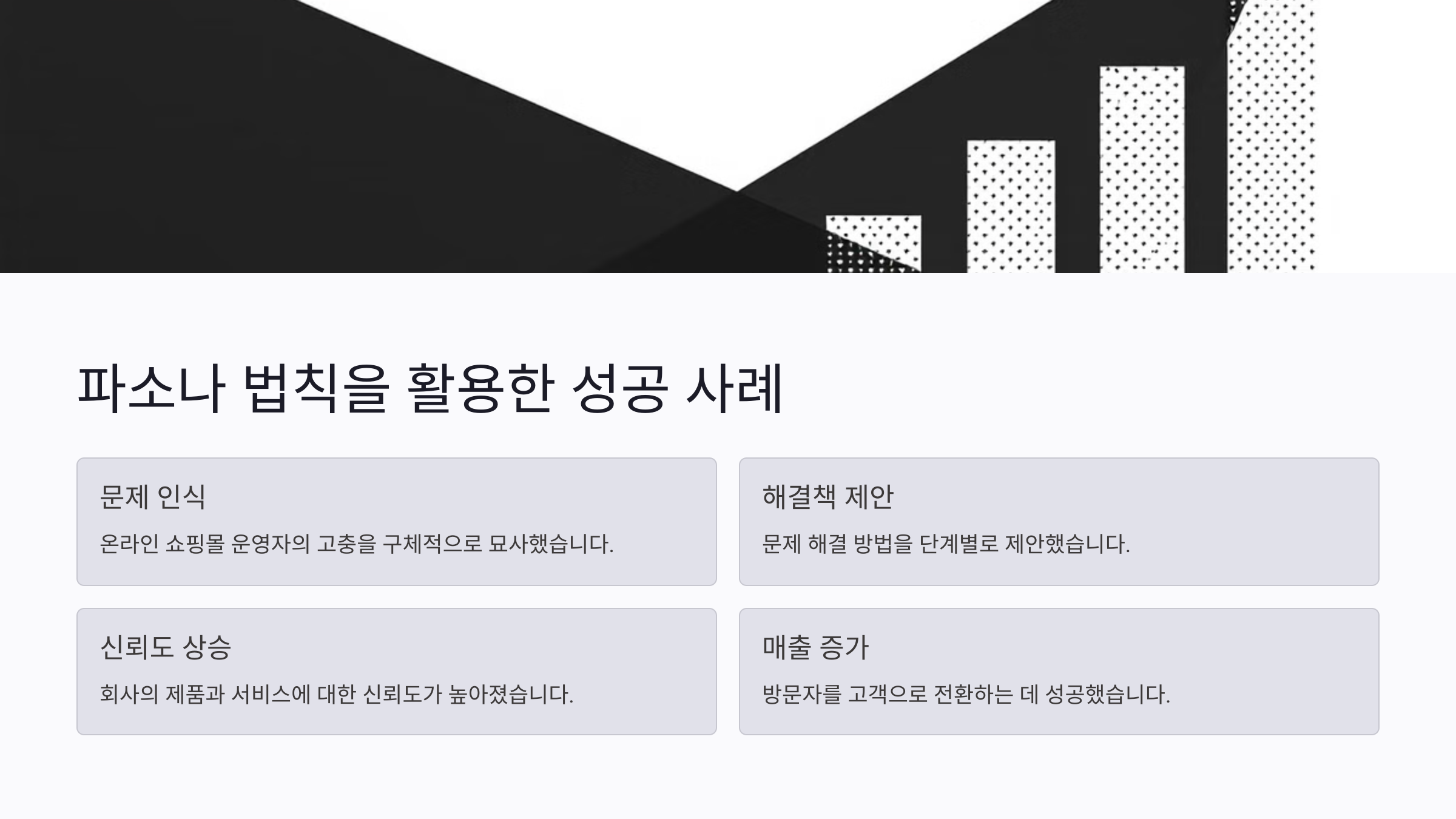 해결책을 제안할 때는 신뢰성을 높이기 위해 성공 사례를 포함하는 것도 좋아요. 예를 들어, "이 전략을 활용한 결과, A기업은 전환율을 30% 개선했고, 매출은 한 달 만에 2배로 증가했습니다" 같은 실제 사례를 제공하면 독자가 제안을 더 믿고 실행할 가능성이 커져요.