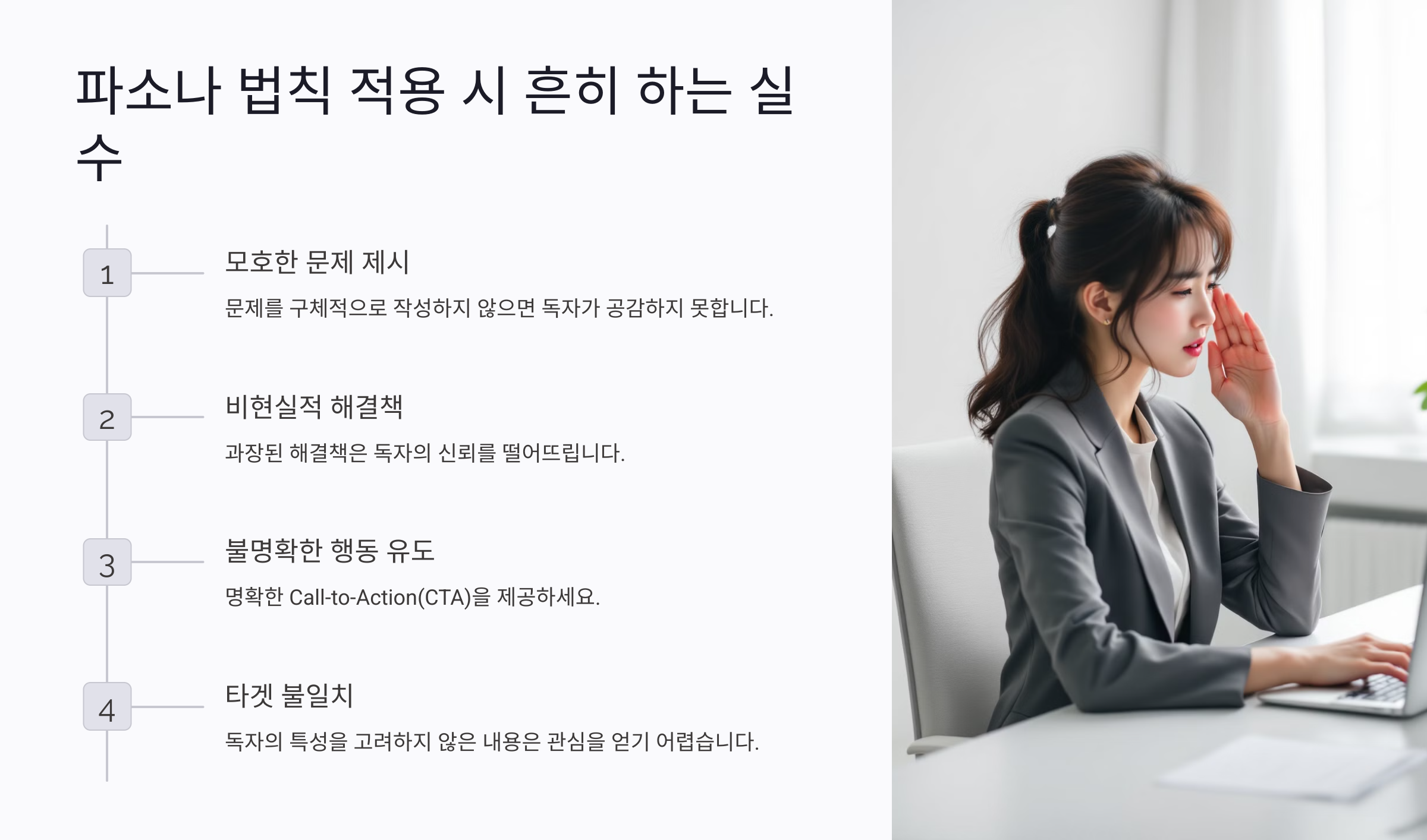 파소나 법칙을 제대로 활용하면 매출을 늘릴 수 있는 강력한 도구가 되지만, 몇 가지 실수를 피해야 해요. 이런 실수들은 글의 설득력을 떨어뜨리고 독자의 관심을 잃게 만들 수 있어요.