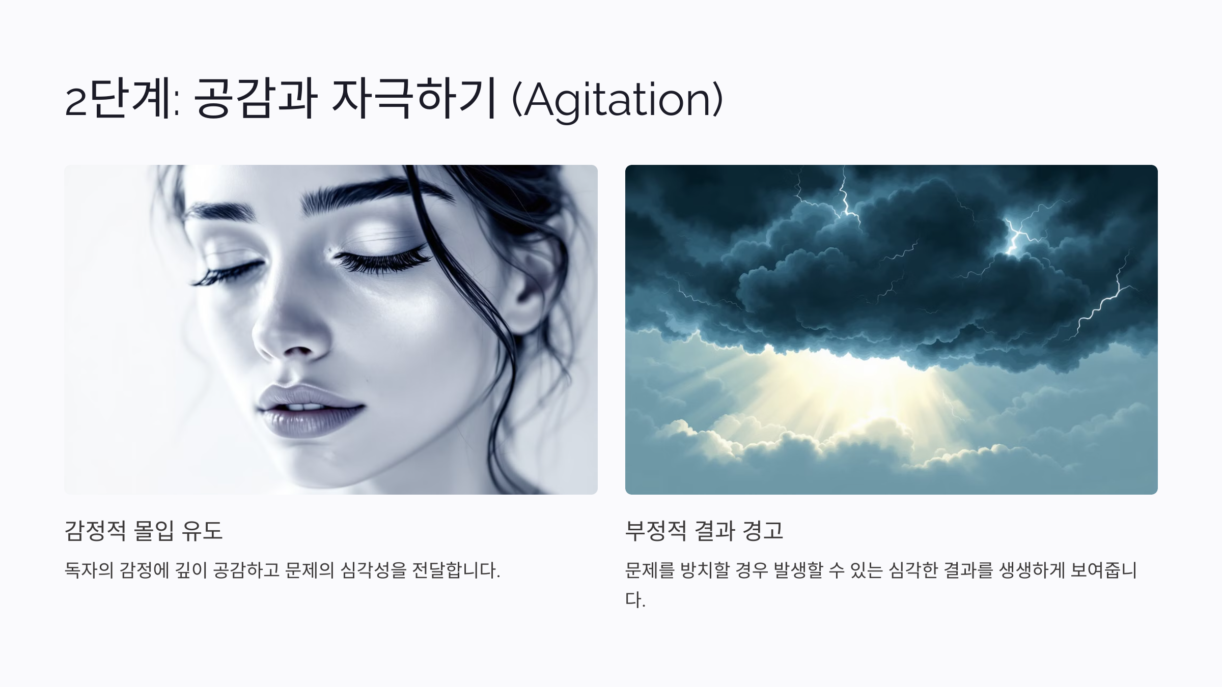문제를 제시한 후에는 독자가 그 문제의 심각성을 느끼도록 공감하고 자극을 주는 단계예요. 이 과정에서 독자는 문제를 해결하지 않으면 어떤 부정적인 결과가 초래될지 상상하게 돼요.