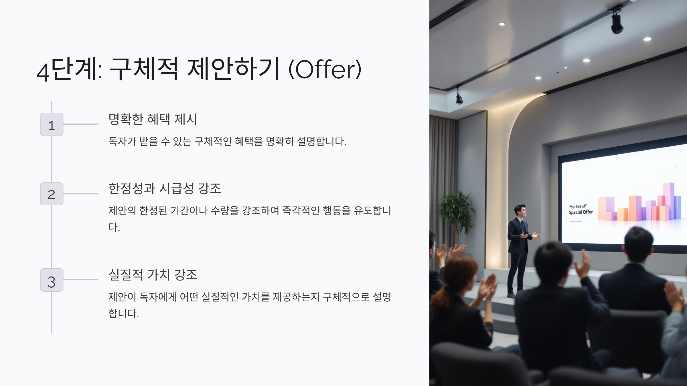 해결책을 제시한 뒤에는 구체적인 제안을 통해 독자가 행동으로 옮기도록 도와야 해요. 이 단계에서는 독자가 제공받을 혜택을 명확히 보여주고, 제안의 시급성을 강조하는 것이 중요해요.