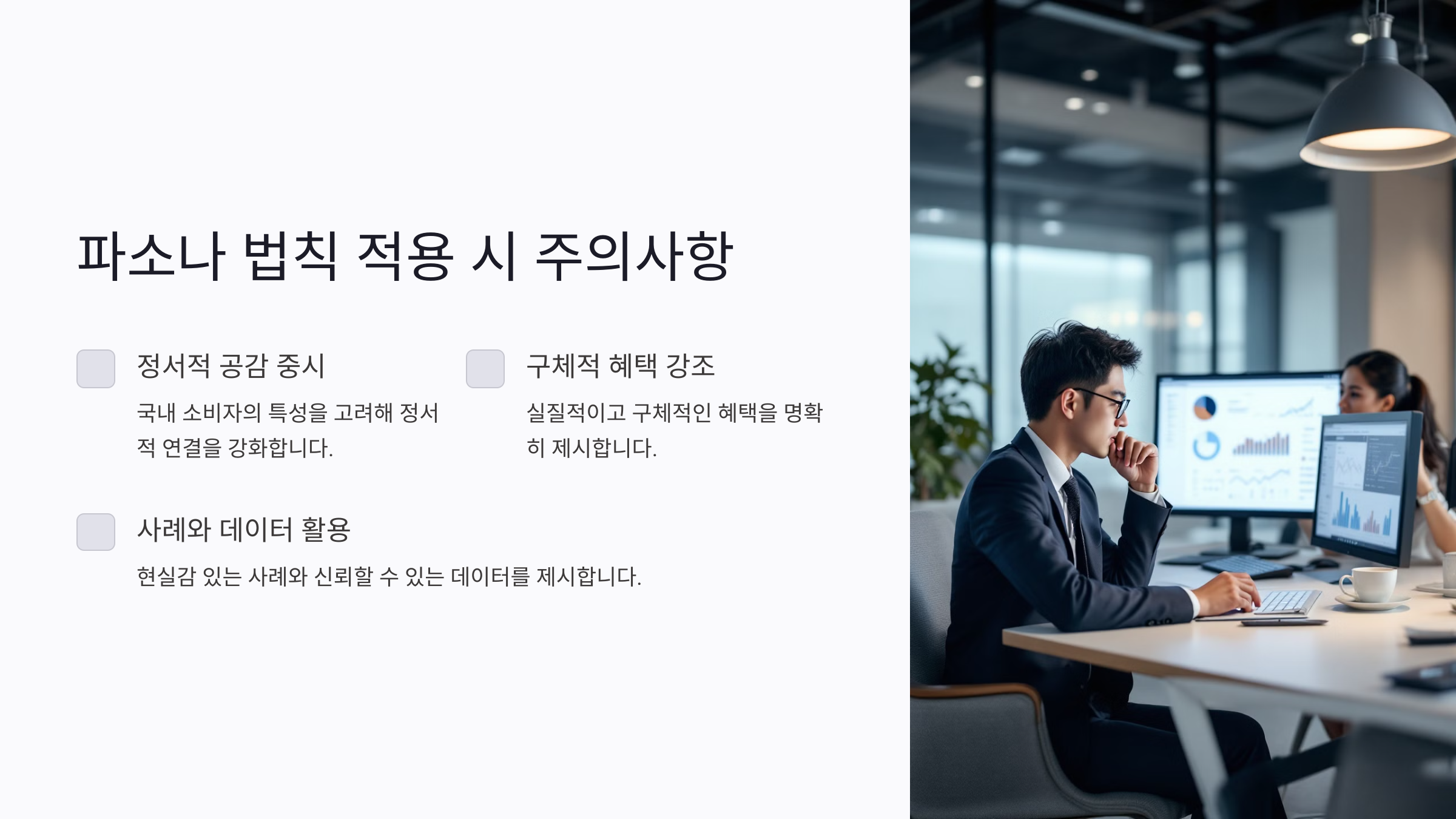 특히 국내 마케팅 환경에서는 소비자가 정서적 연결과 구체적인 혜택을 중시하기 때문에 파소나 법칙이 매우 효과적으로 작용해요. 이를 통해 단순한 정보 전달을 넘어 고객의 행동을 이끌어내고, 실질적인 전환율을 높일 수 있답니다.
