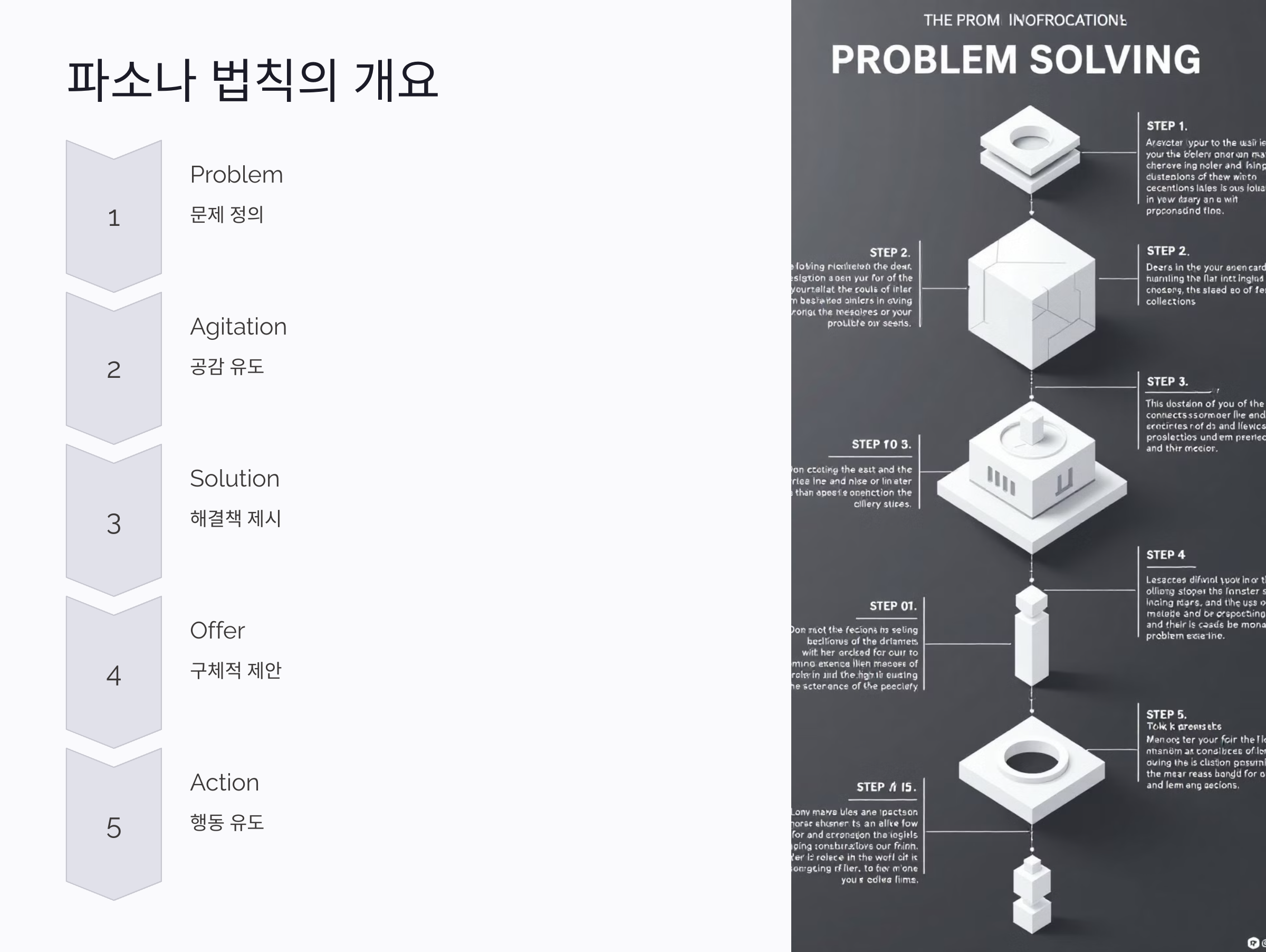 파소나 법칙은 Problem(문제), Agitation(공감), Solution(해결책), Offer(제안), Action(행동)이라는 5단계로 구성돼요. 이 구조는 단순하지만 매우 강력한 설득력을 발휘해요. 각 단계는 독자의 심리적 흐름을 고려해 설계되어 있기 때문에, 자연스럽게 고객이 행동하도록 유도할 수 있어요.