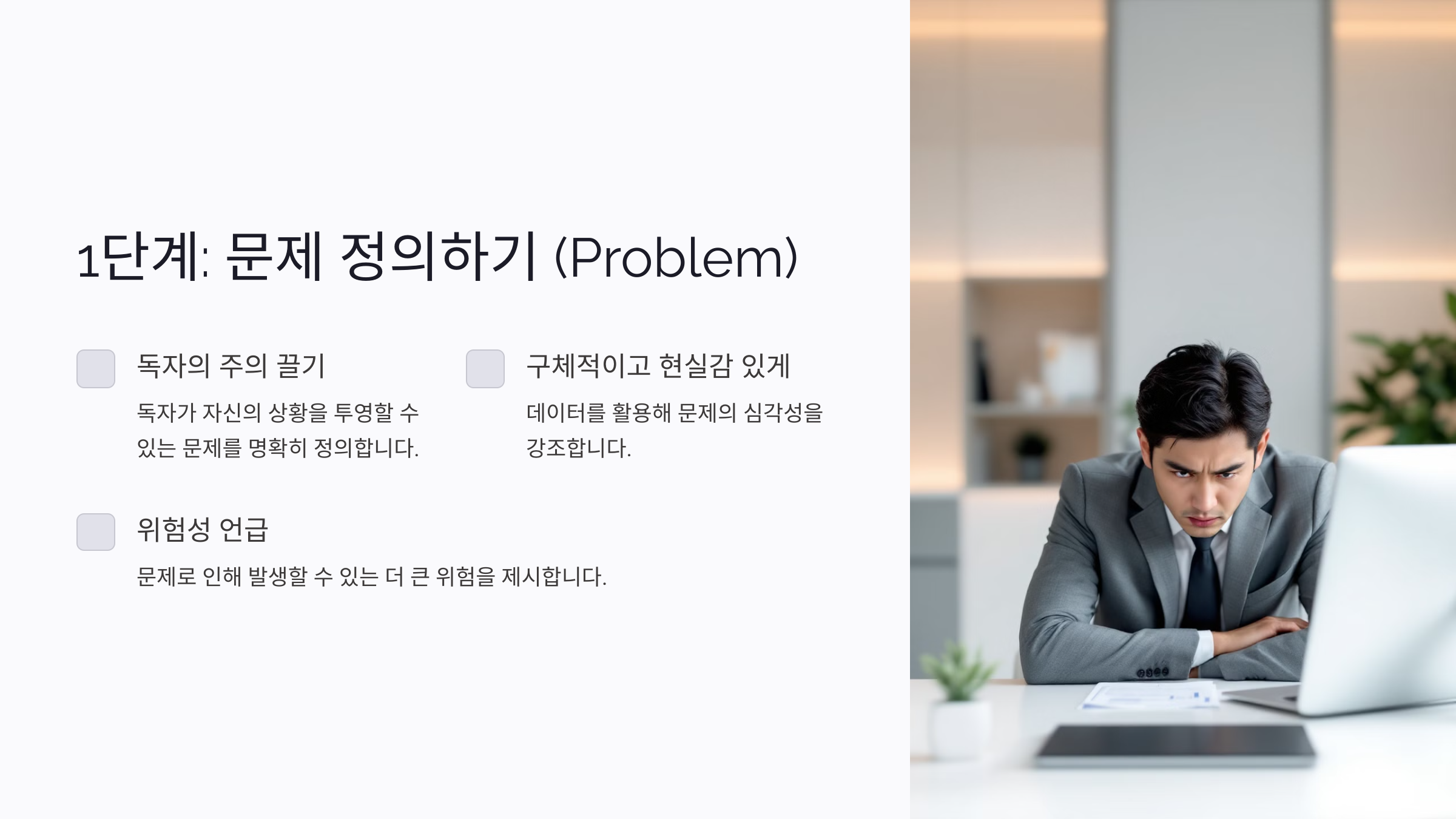 파소나 법칙의 첫 단계는 독자가 겪고 있는 문제를 명확히 정의하는 거예요. 이 단계에서는 독자의 주의를 끌고, 글에 몰입하도록 만드는 것이 중요해요. 문제를 제시할 때는 독자가 자신의 상황을 그대로 투영할 수 있어야 해요.