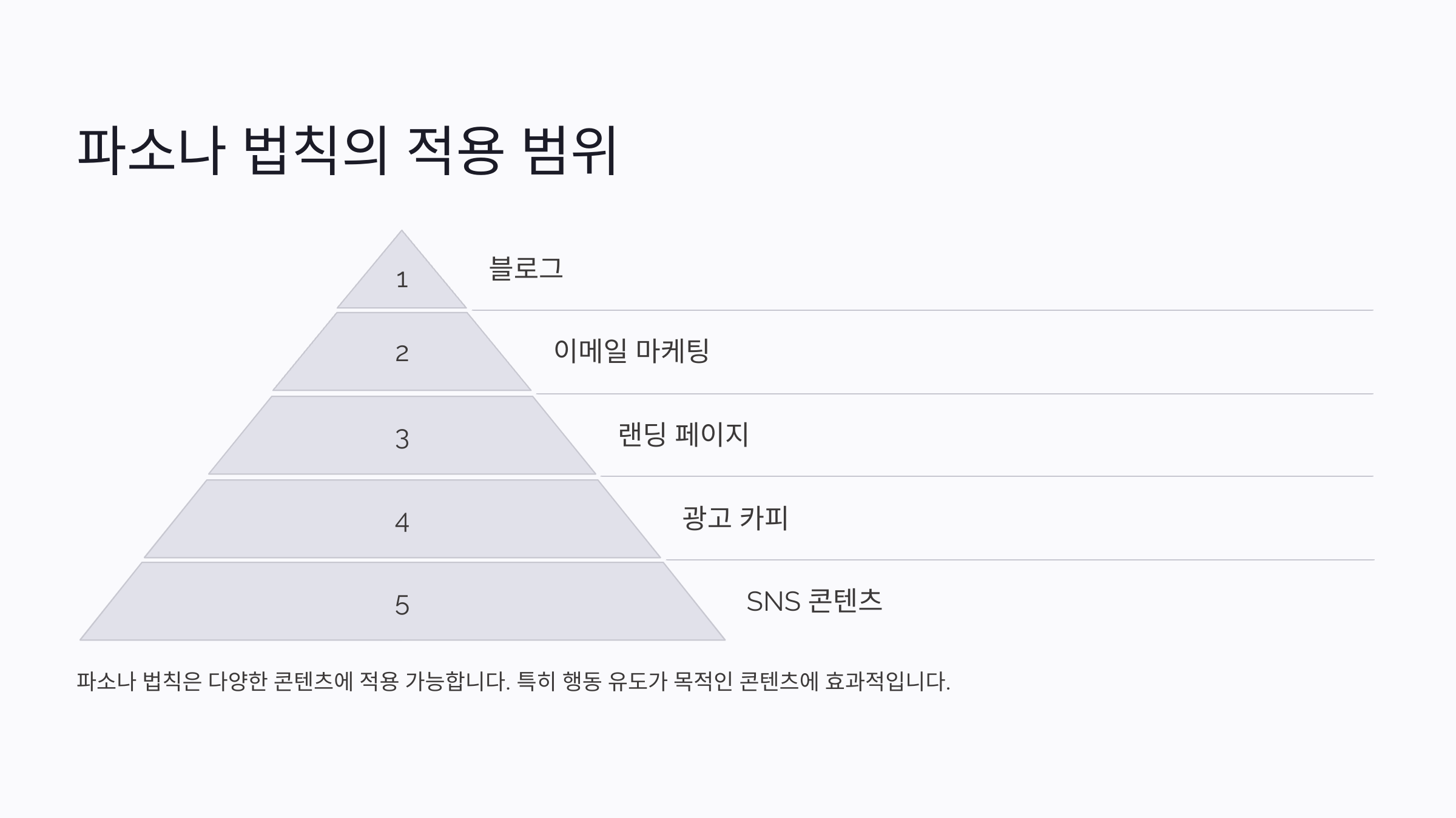 A1. 파소나 법칙은 블로그, 이메일, 랜딩 페이지, 광고 카피, 심지어 SNS 콘텐츠에도 활용 가능해요. 특히 행동을 유도하는 목적이 있는 콘텐츠에 적합해요.