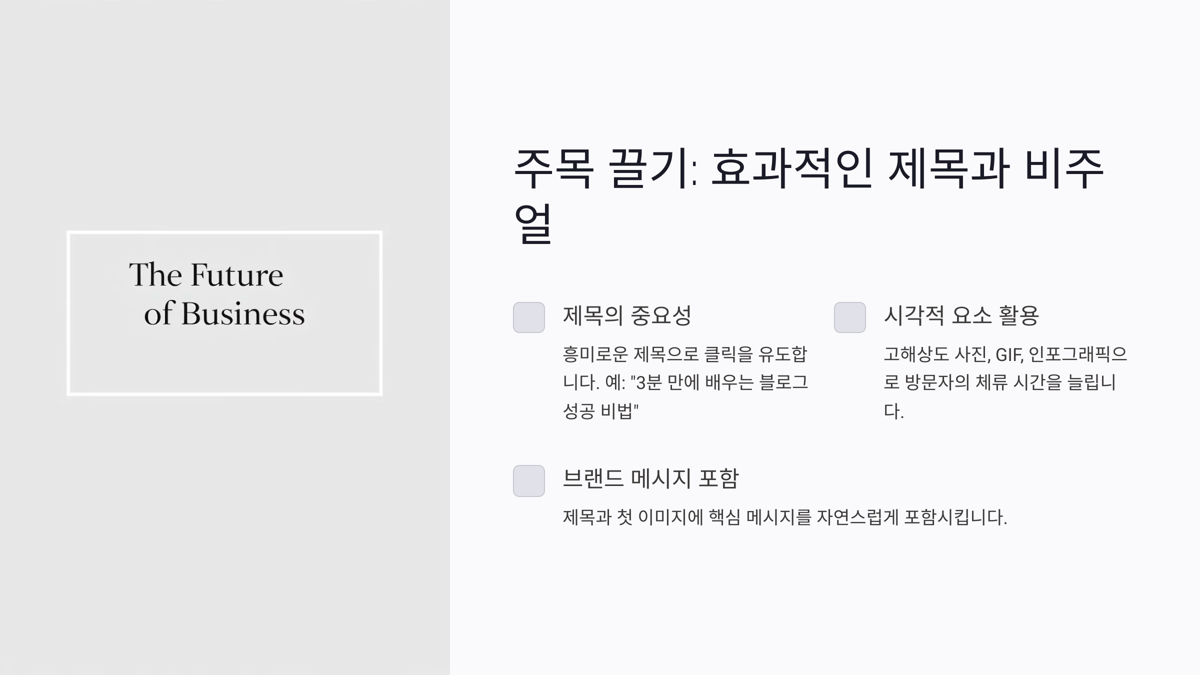 블로그에서 고객의 시선을 사로잡는 첫 번째 단계는 효과적인 제목과 시각적 요소예요. 사람들은 제목을 보고 게시물을 클릭할지 결정하므로, 제목은 고객의 흥미를 유발하는 방식으로 작성해야 해요. 예를 들어, 숫자를 활용한 제목("3분 만에 배우는 블로그 성공 비법")이나, 질문형 문구("왜 블로그 방문자가 줄어들까요?")는 클릭을 유도하는 데 효과적이에요.