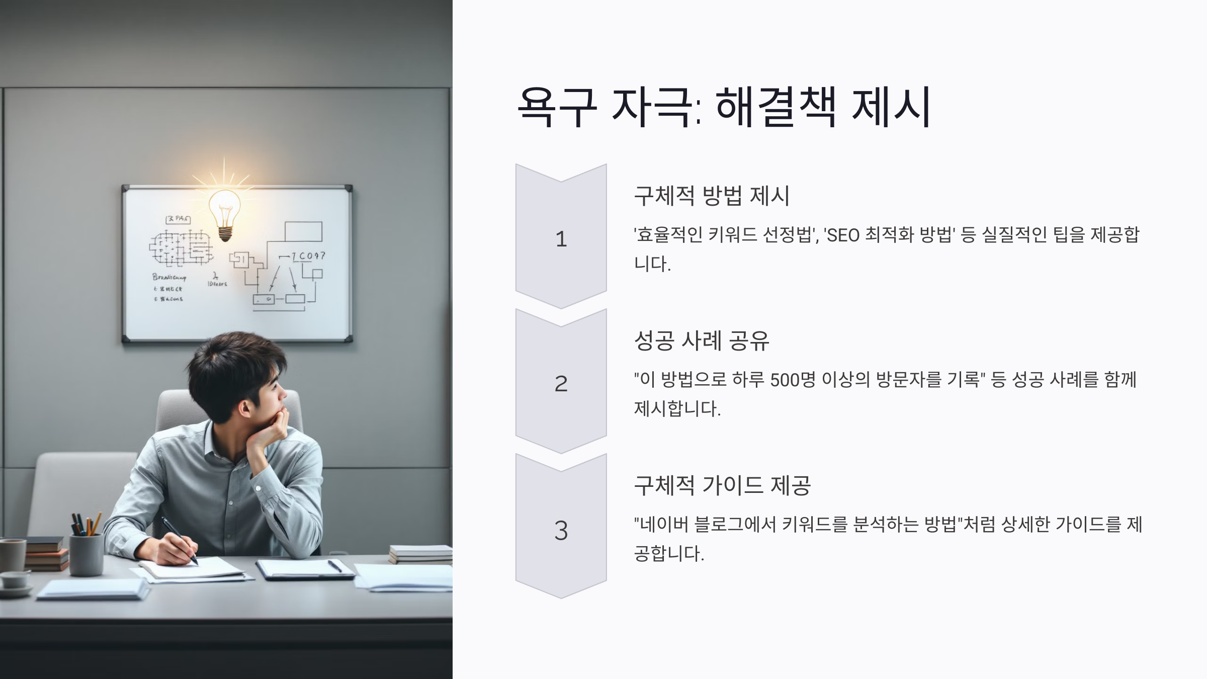 고객의 관심을 사로잡았다면, 이제는 그들의 욕구를 자극해야 해요. 이 단계에서는 문제를 해결할 수 있는 구체적인 방법을 제시하는 것이 중요해요. 예를 들어, 블로그 방문자를 늘리고 싶어하는 사람들에게는 '효율적인 키워드 선정법', 'SEO 최적화 방법'과 같은 실질적인 팁을 제공하면 좋아요.