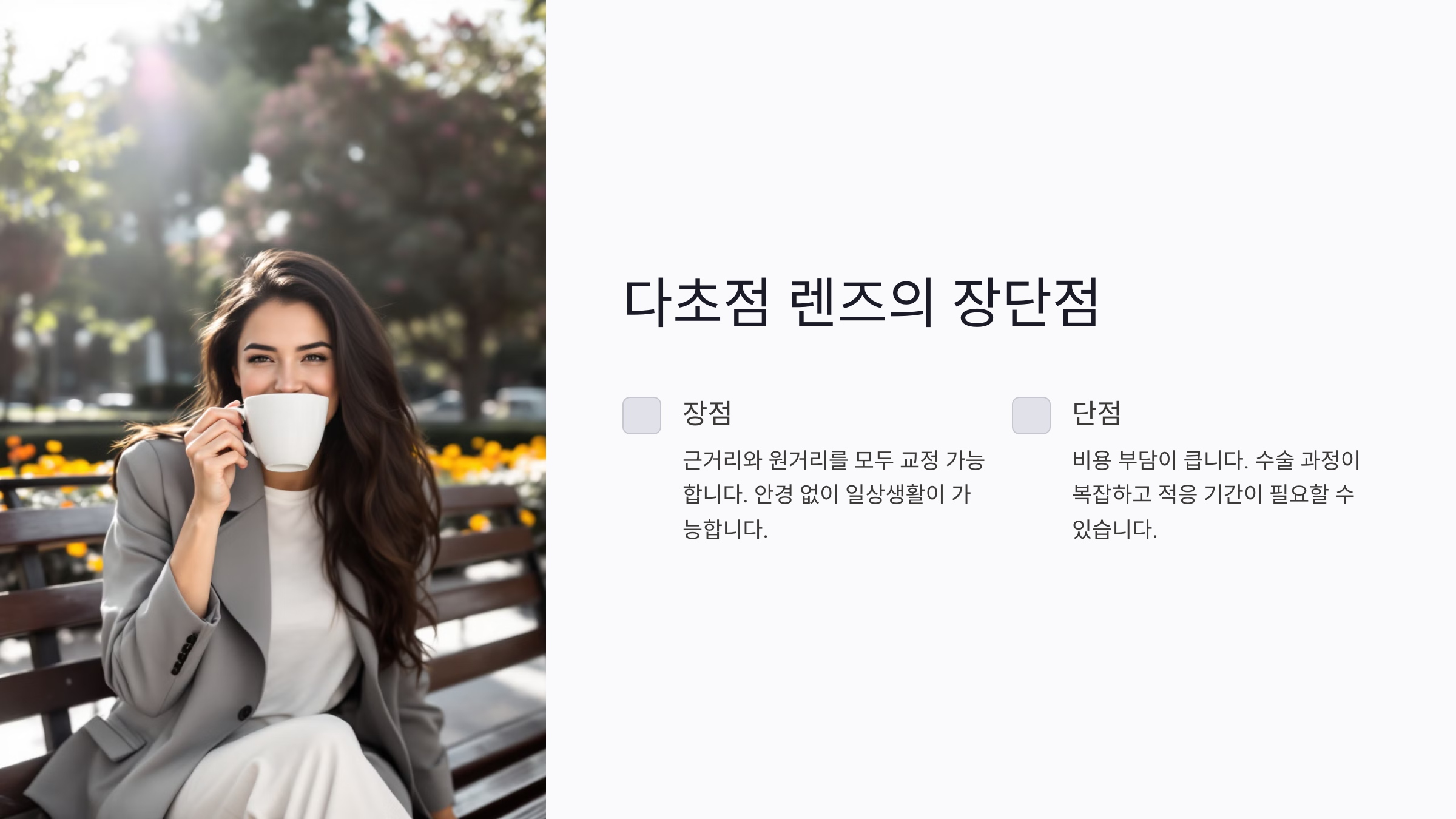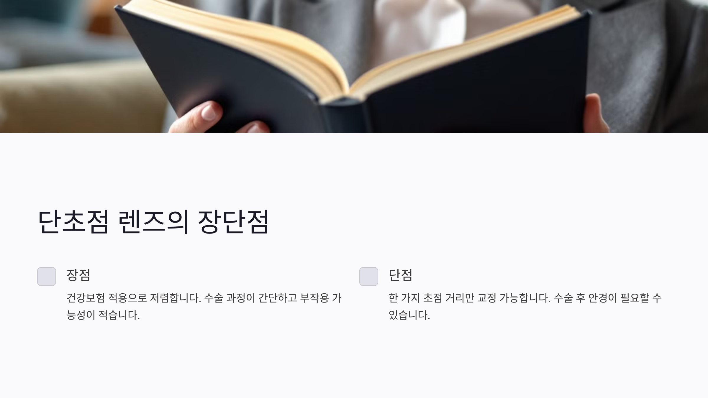 - 한 가지 초점 거리만 교정 가능하므로, 수술 후 안경이 필요할 수 있어요.