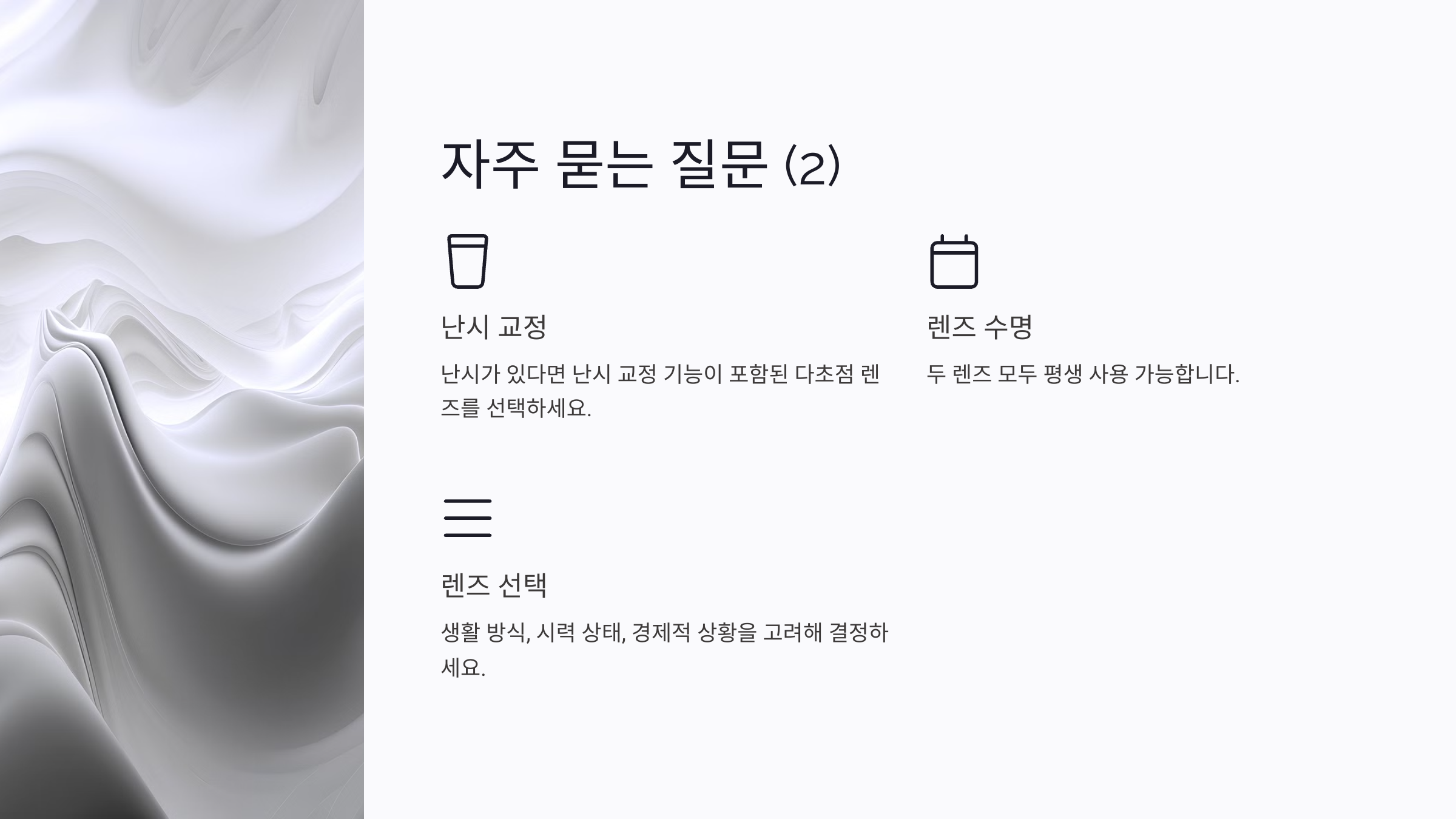 A8. 렌즈 선택은 자신의 생활 방식, 시력 상태, 경제적 상황을 모두 고려해 결정해야 해요. 수술 전 전문의와 충분히 상담해보는 것이 가장 중요해요.