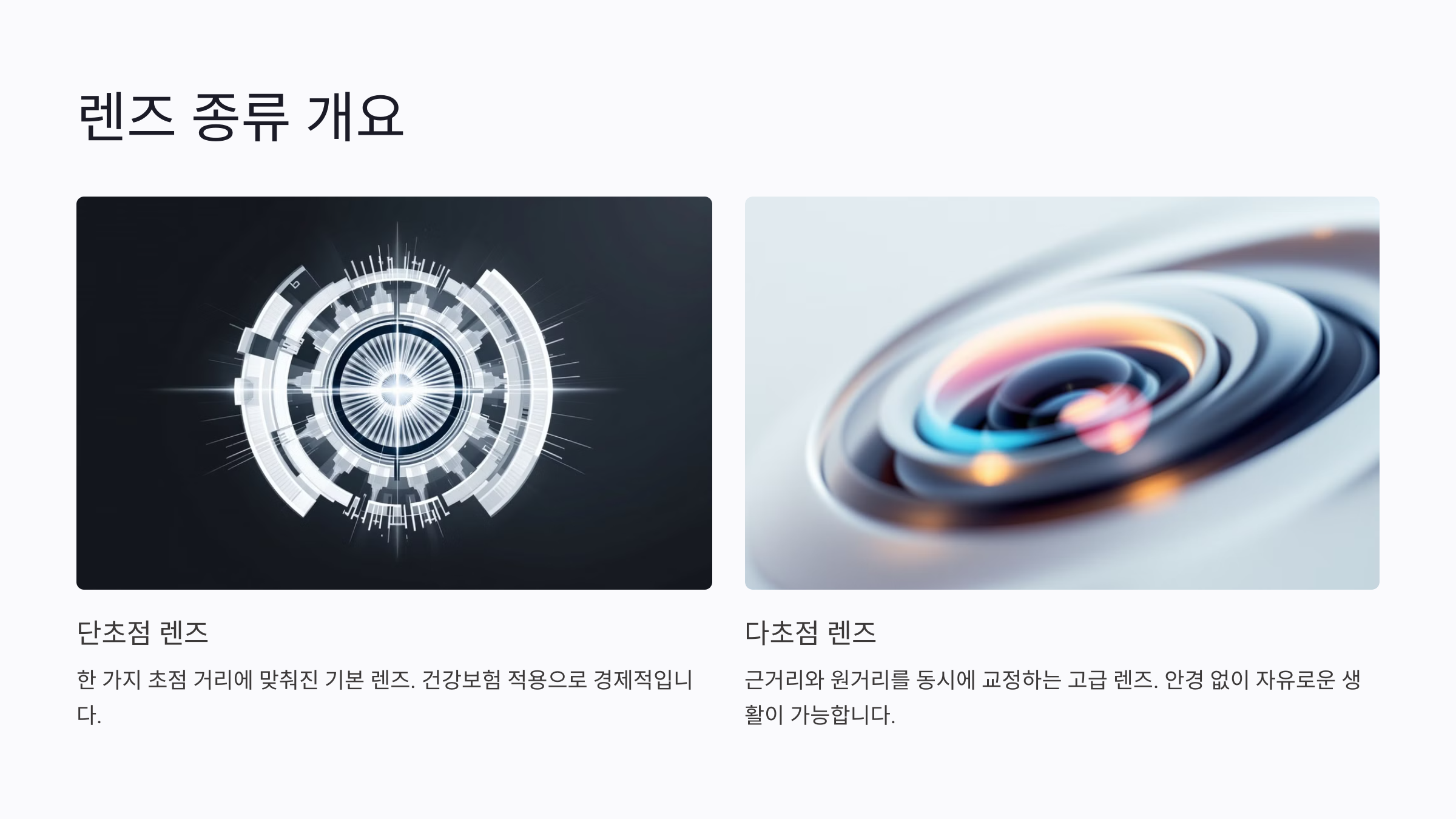 백내장 수술에서 가장 중요한 결정 중 하나는 바로 사용할 인공수정체 렌즈의 선택이에요. 단초점 렌즈와 다초점 렌즈는 각각의 장단점과 비용 차이가 뚜렷해요. 나에게 맞는 렌즈를 고르기 위해서는 렌즈의 특성과 본인의 생활 방식을 잘 이해하는 것이 중요하답니다.