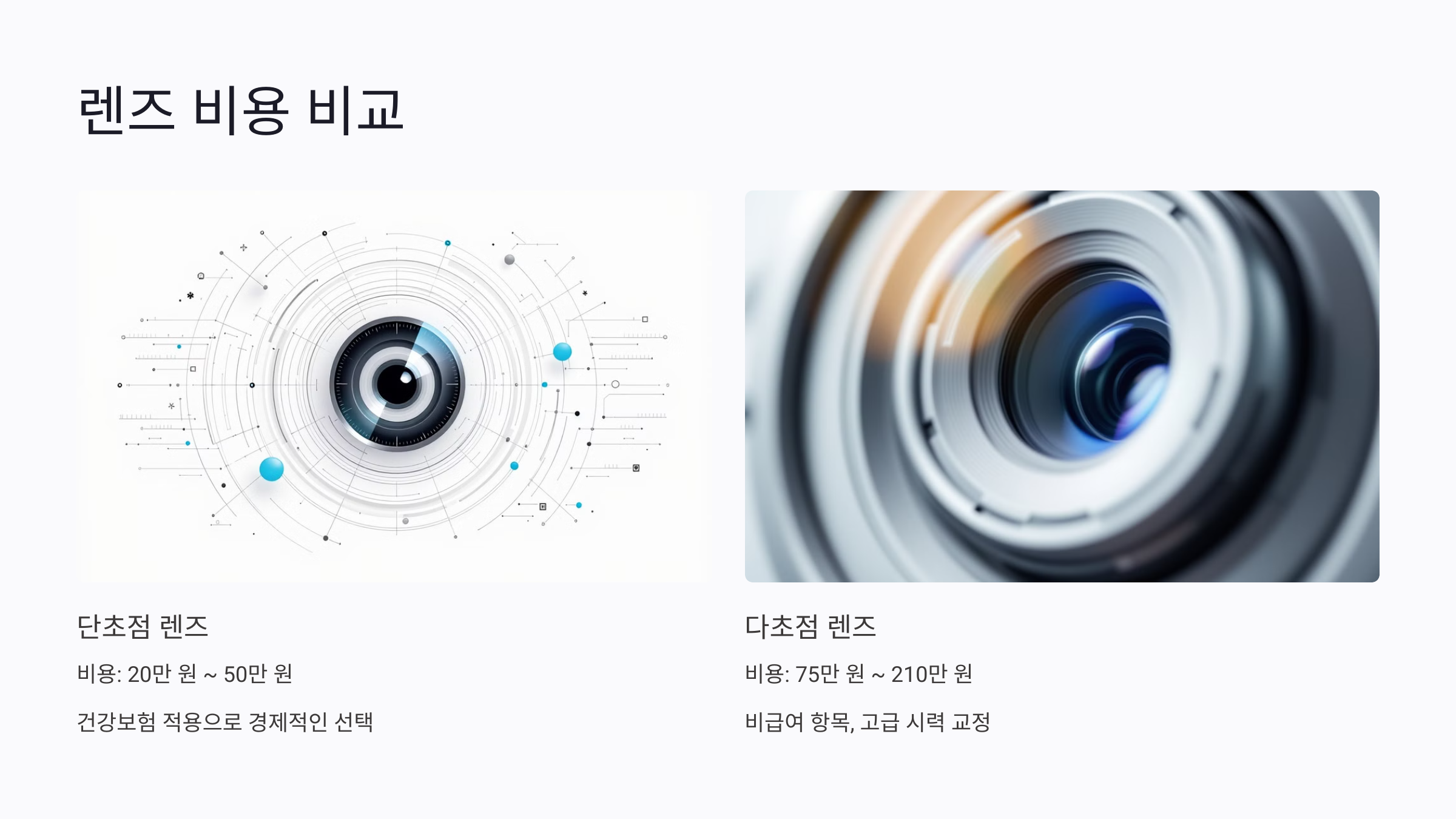 단초점 렌즈는 건강보험과 실비보험 적용이 가능해 비교적 저렴해요. 경제적 부담을 줄이고 싶다면 단초점 렌즈가 적합할 수 있어요. 반면, 다초점 렌즈는 보험 적용이 제한적이므로 추가 비용 부담이 커요.