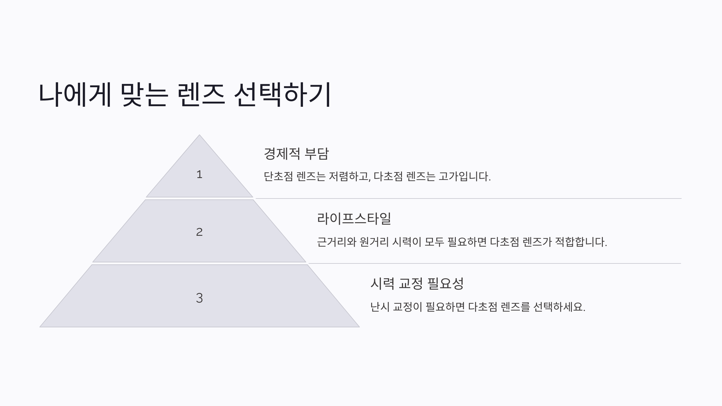 단초점 렌즈와 다초점 렌즈 중 어떤 렌즈가 나에게 적합한지 결정하려면, 자신의 생활 방식과 경제적 여건을 함께 고려해야 해요. 다음은 선택 시 고려해야 할 주요 요소들이에요.