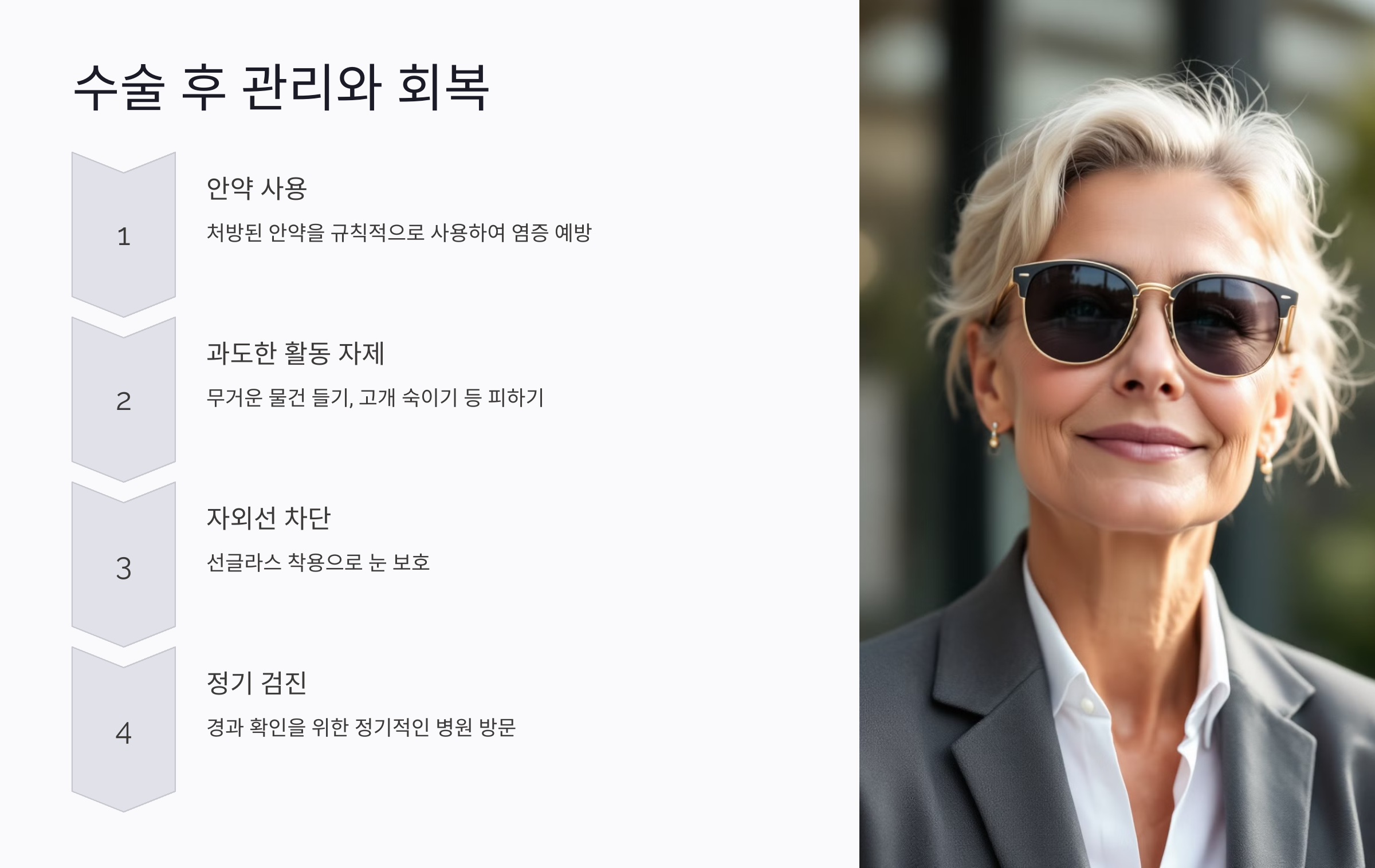 백내장 수술 후에는 적절한 관리가 반드시 필요해요. 일반적으로 수술 직후 약간의 눈부심이나 뿌연 시야를 경험할 수 있지만, 대부분은 시간이 지나면서 점차 좋아져요. 의사가 처방한 안약을 규칙적으로 사용하면 염증을 예방하고 회복을 촉진할 수 있어요.