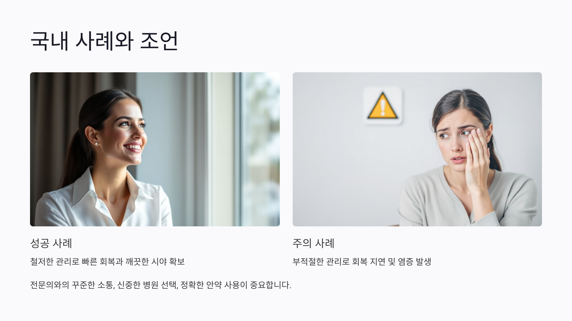 국내 사례를 보면, 수술 전후 관리의 중요성이 강조되는 경우가 많아요. 한 사례에서는 환자가 수술 후 관리 지침을 제대로 따르지 않아 회복 속도가 느려지고 염증이 발생한 경우가 있었어요. 반대로, 지침을 철저히 지킨 환자는 빠른 회복과 깨끗한 시야를 되찾았답니다.