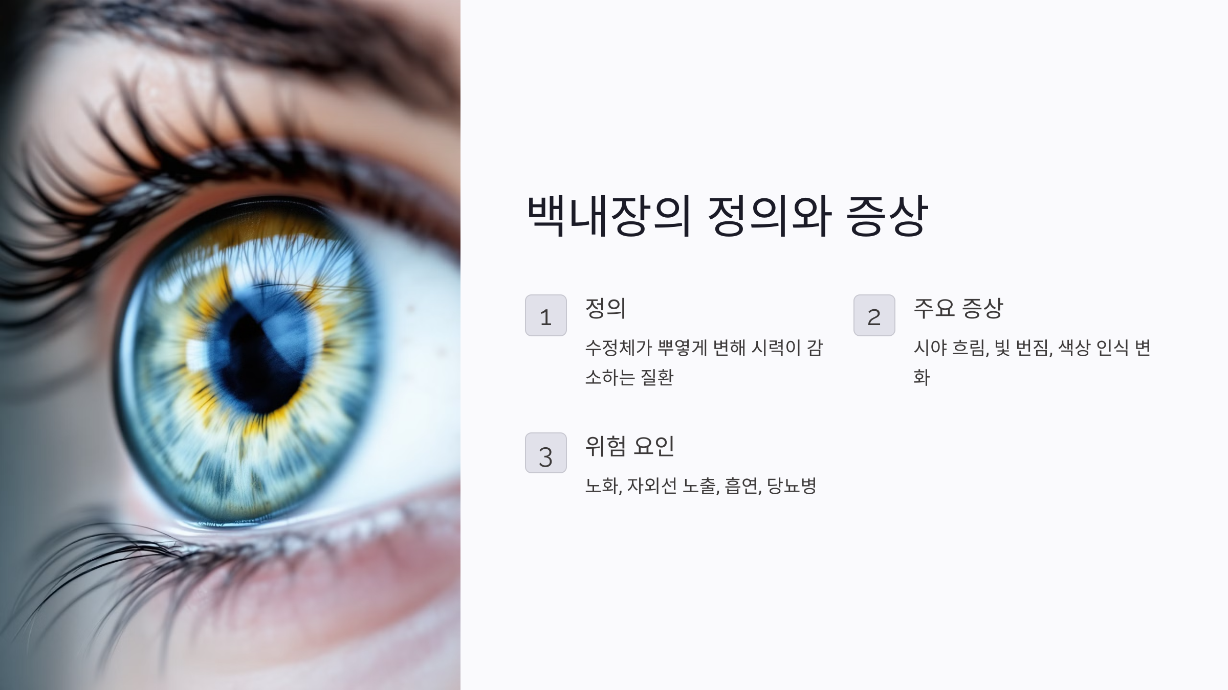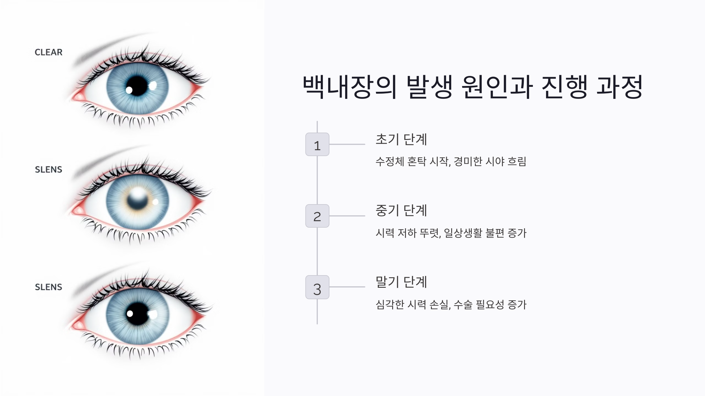 백내장은 수정체(렌즈)가 혼탁해져 시력이 저하되는 질환이에요. 원래 수정체는 투명한 구조로, 외부에서 들어온 빛을 망막에 정확히 전달하는 역할을 해요. 그런데 백내장이 발생하면 수정체가 뿌옇게 변하고 빛이 제대로 통과하지 못해 흐릿하거나 왜곡된 시야를 경험하게 되죠. 심한 경우에는 거의 실명에 가까운 상태가 될 수도 있어요.