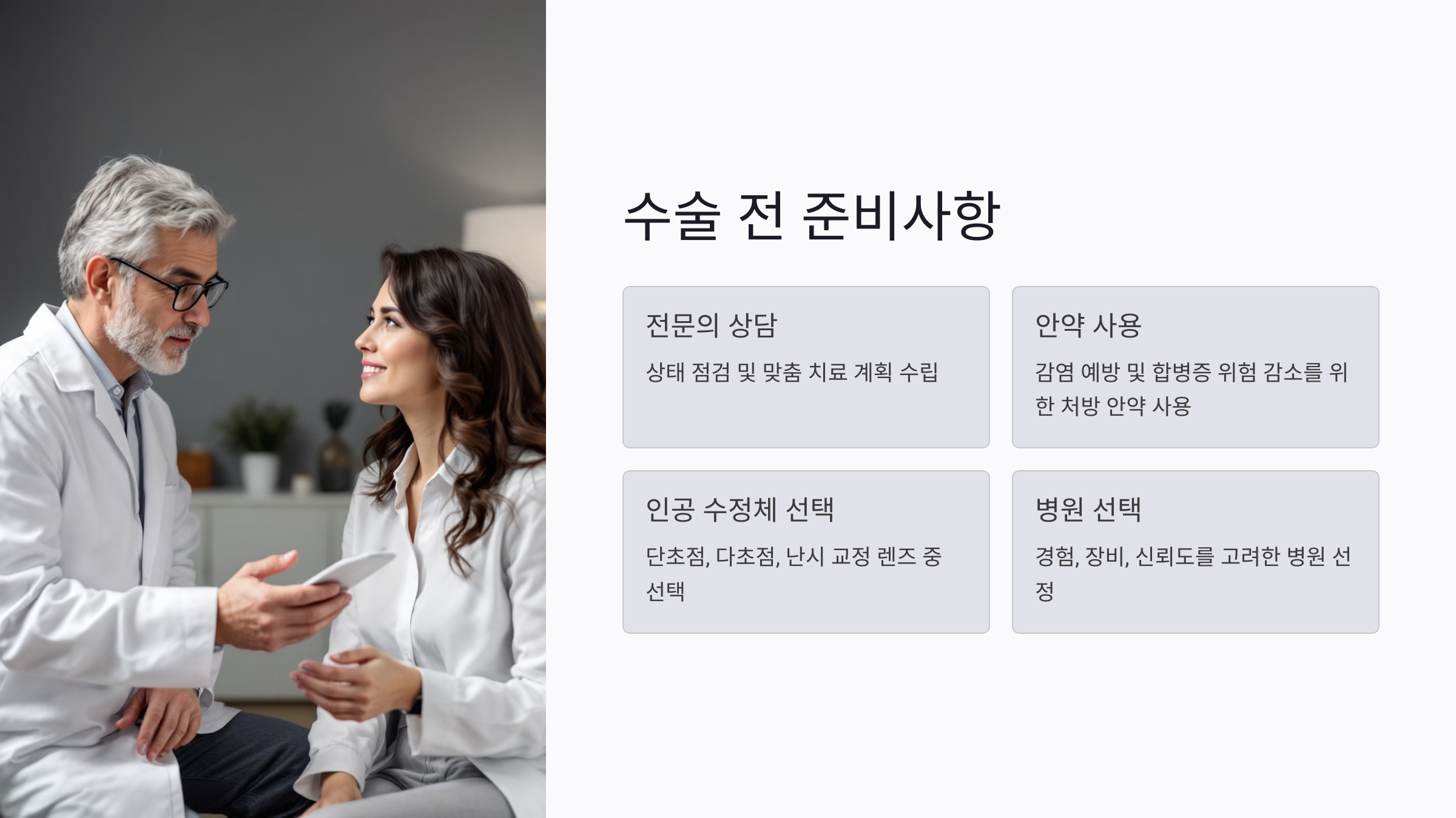 수술 전에는 특별히 처방된 안약을 사용해야 할 수도 있어요. 이는 눈의 감염을 예방하고 수술 중 합병증 위험을 줄이는 데 도움을 줘요. 또한, 수술 당일에는 눈 화장을 피하고, 의사의 지시에 따라 금식이나 약물 복용을 조절해야 한답니다.