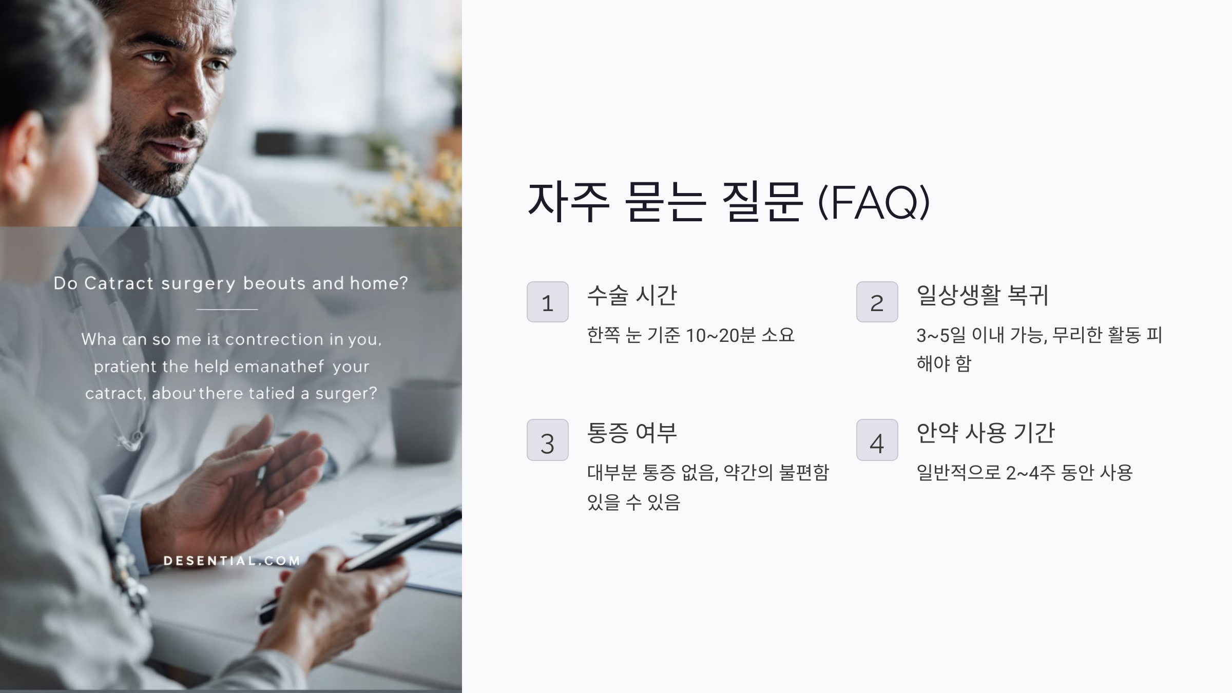 A2. 수술 후 1~2일 정도는 안정이 필요하지만, 대부분의 경우 3~5일 이내에 일상생활이 가능해요. 단, 무리한 활동은 피해야 해요.
