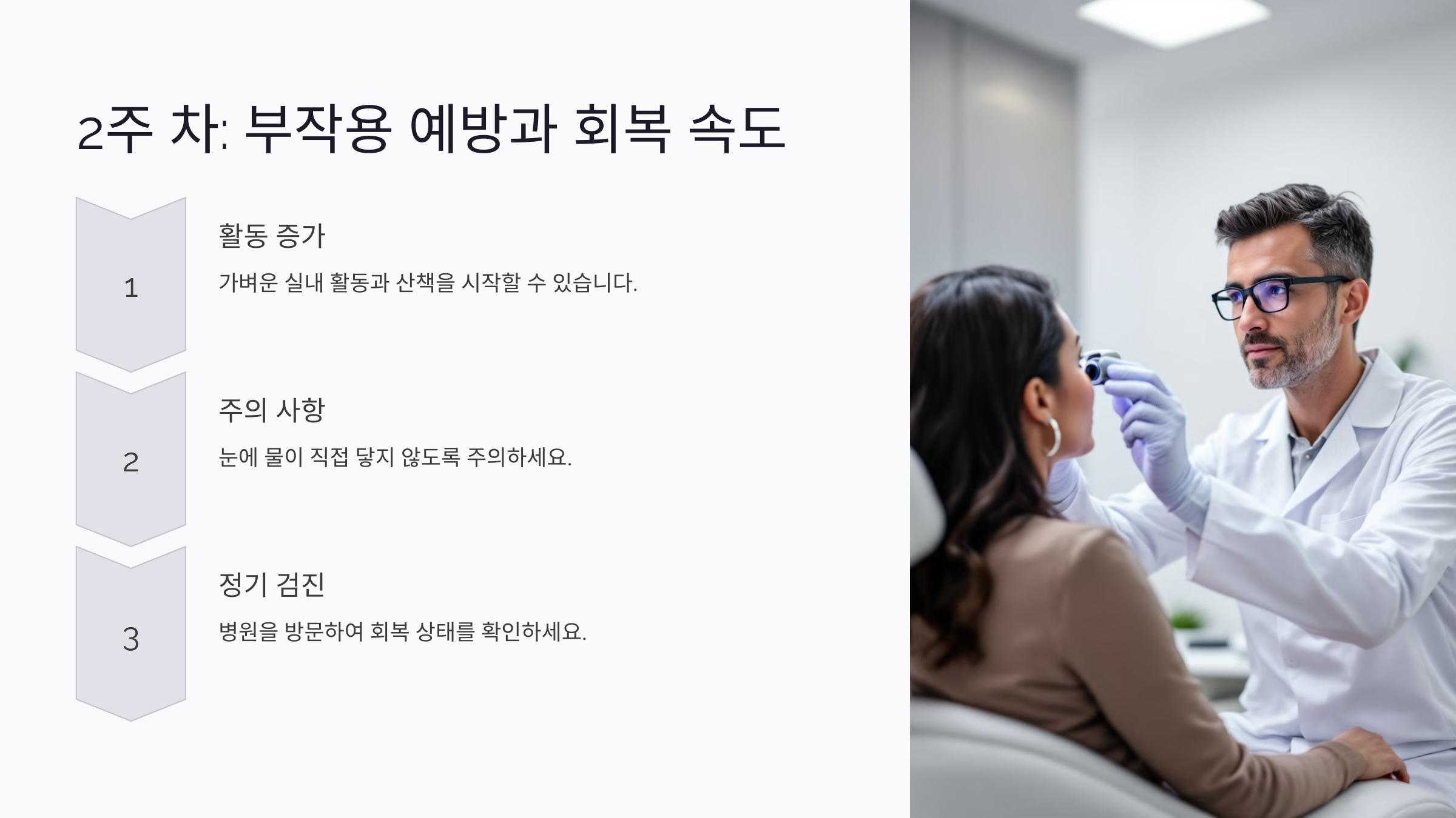 눈에 직접 물이 닿는 것은 여전히 금지해야 해요. 샤워 시에는 눈에 물이 들어가지 않도록 세심하게 주의하고, 특히 눈을 비비는 행동은 절대 해서는 안 돼요. 수술 부위에 자극이 가해지면 염증이 생길 위험이 있답니다.