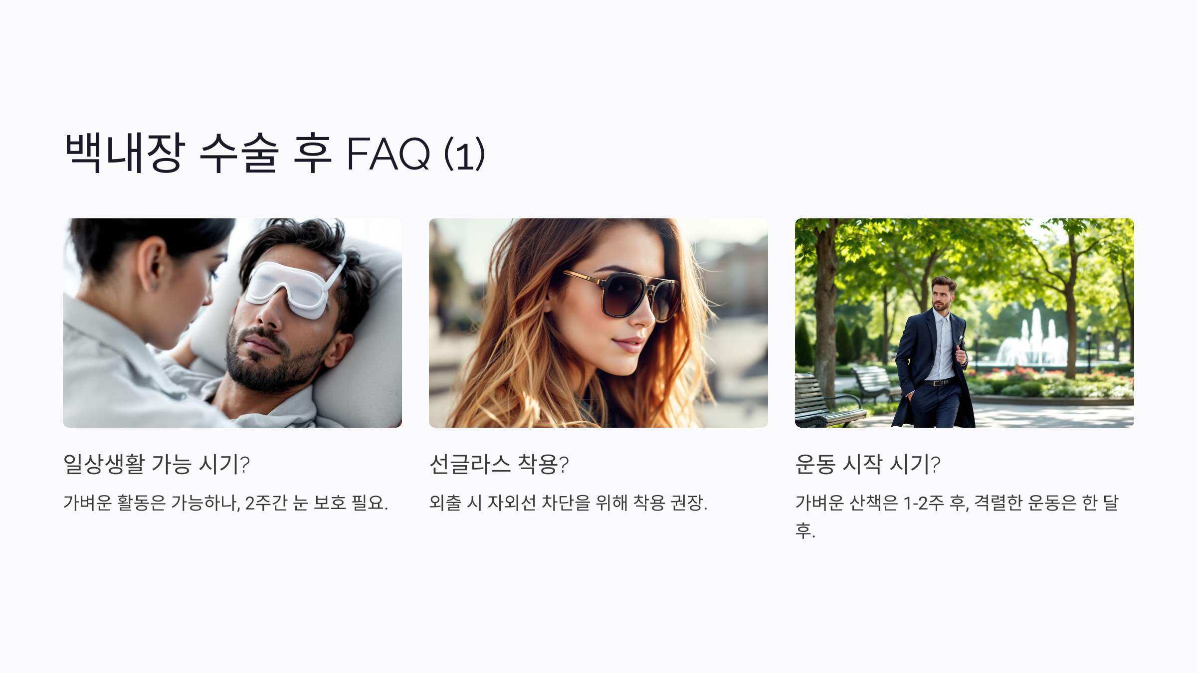 A1. 가벼운 활동은 가능하지만, 최소 2주 동안은 무리하지 말고 눈을 보호해야 해요.