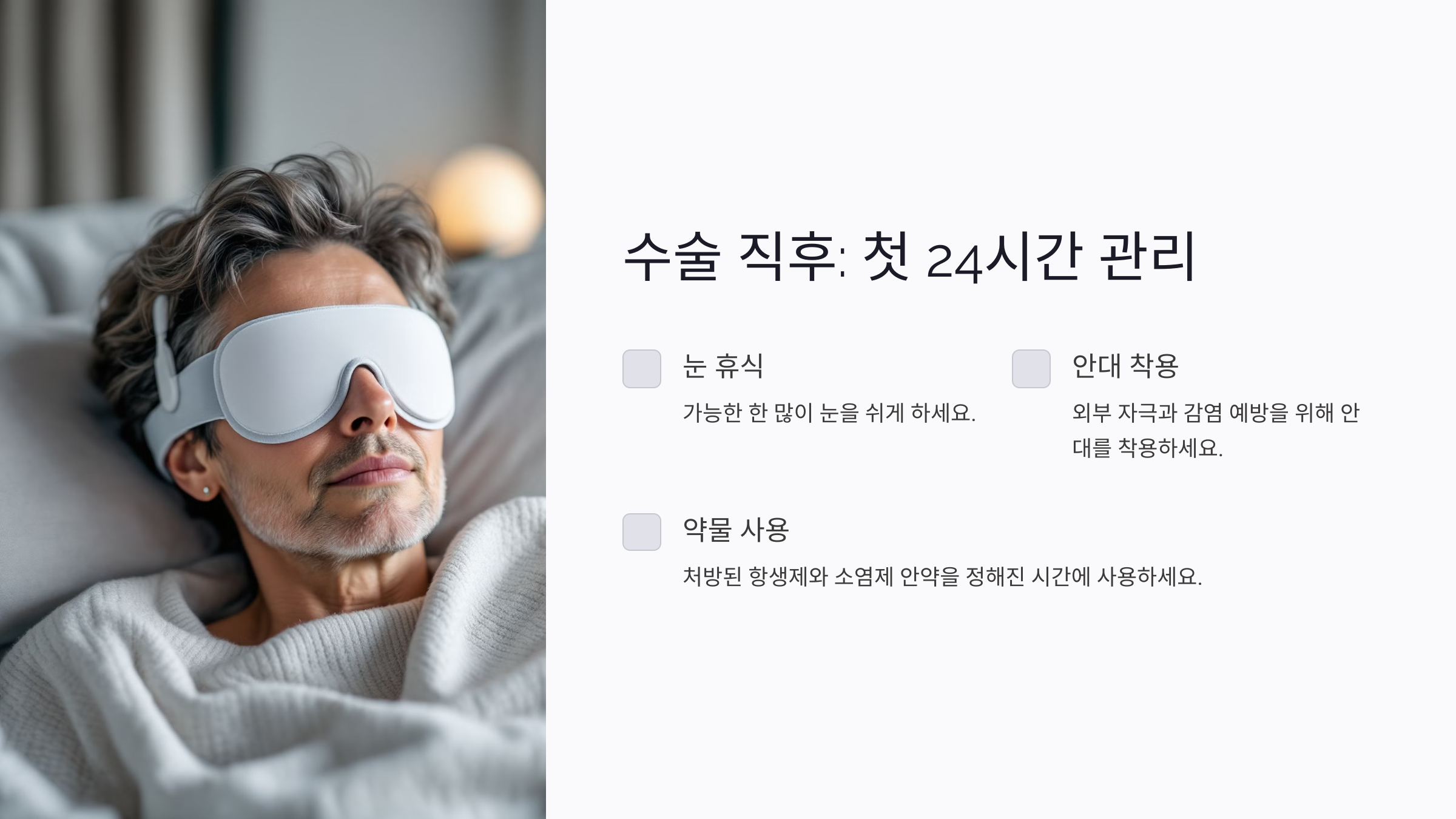 백내장 수술 직후 첫 24시간은 가장 중요한 회복 단계 중 하나예요. 이 시기에는 눈을 가능한 한 많이 쉬게 하는 것이 좋아요. 수술 후 병원을 떠날 때 눈에 보호용 안대를 착용하게 되는데, 집에 도착한 뒤에도 이 안대를 착용하고 있어야 해요. 안대는 외부 자극과 감염을 예방해 준답니다.