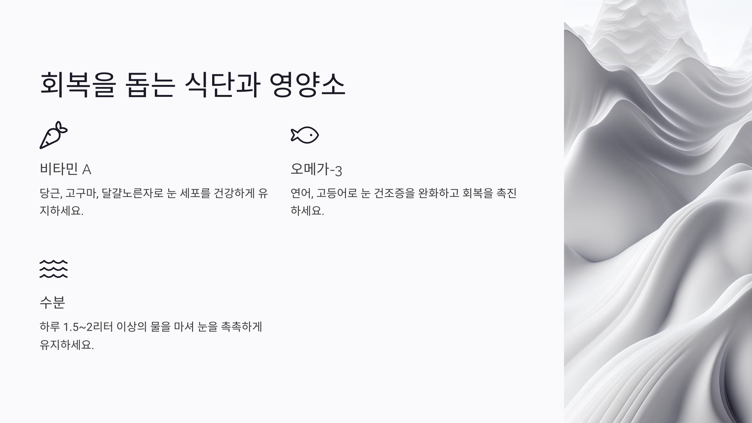 장기적으로는 건강한 식단과 생활 습관이 중요해요. 눈 건강을 유지하는 데 필요한 루테인, 비타민 A, 오메가-3 같은 영양소를 충분히 섭취하는 것도 잊지 마세요.
