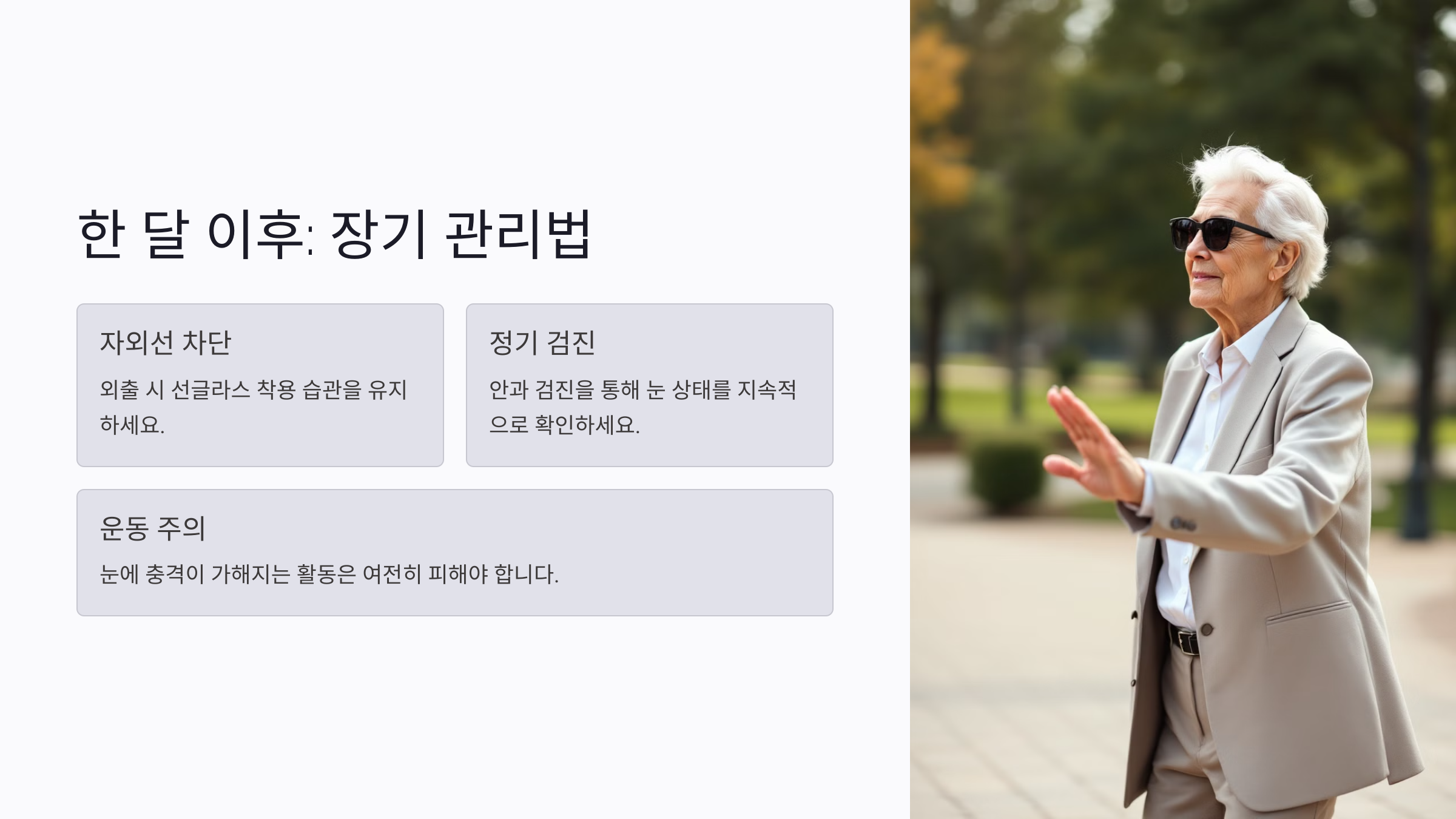 수술 후 한 달이 지나면 대부분의 환자가 정상적인 생활로 복귀할 수 있어요. 하지만 눈 건강을 유지하기 위해 꾸준한 관리가 필요해요. 이 시기에는 여전히 자외선 차단이 중요하니, 외출 시에는 선글라스를 착용하는 습관을 유지하는 것이 좋아요.