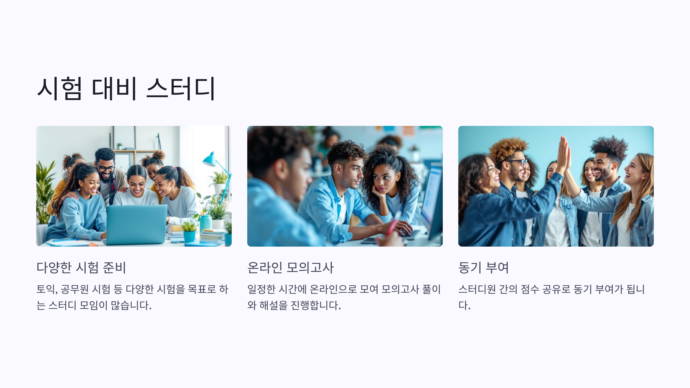 토익, 공무원 시험 등 다양한 시험을 목표로 하는 스터디 모임이 많습니다.
