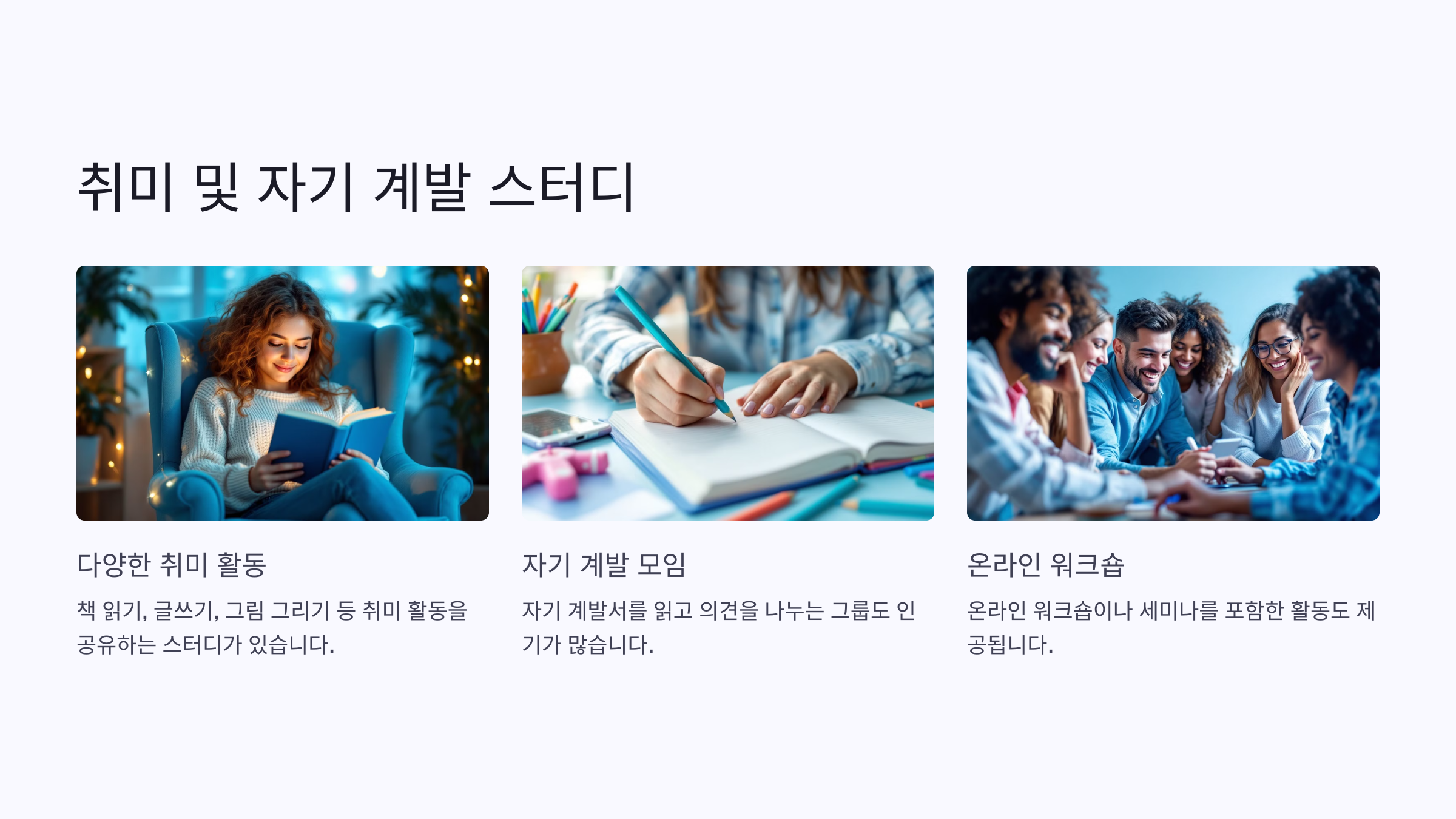 책 읽기, 글쓰기, 그림 그리기 등 취미 활동을 공유하는 스터디가 있습니다.