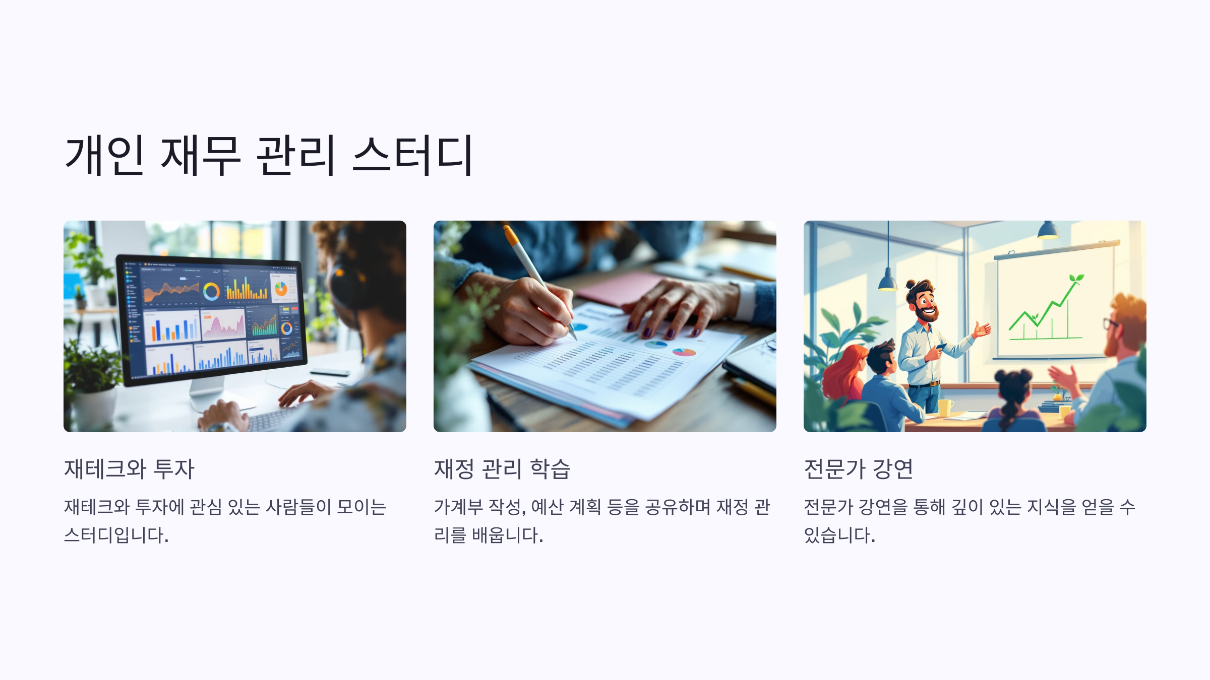가계부 작성, 예산 계획 등을 공유하며 재정 관리를 배웁니다.