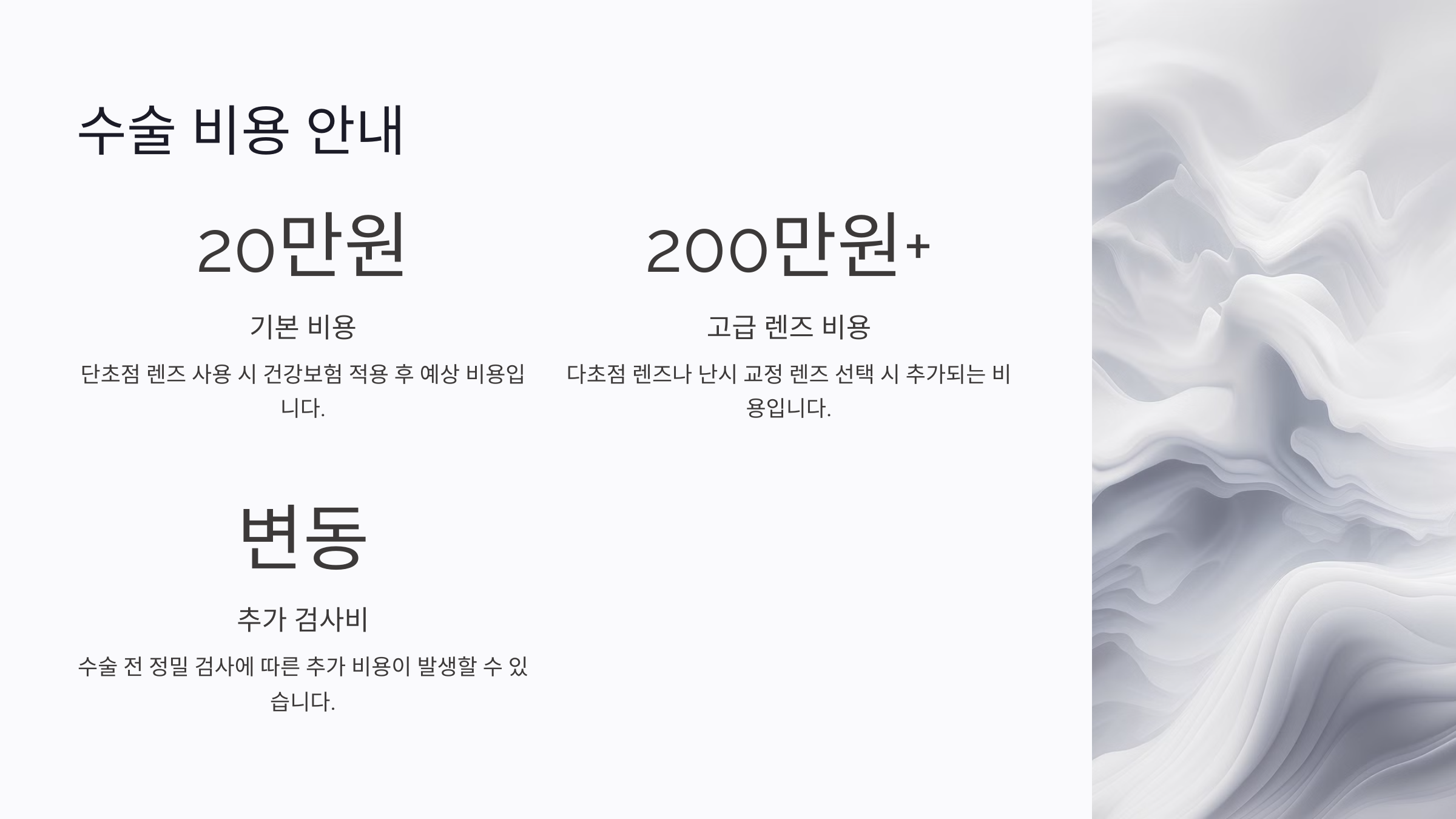 6) 비용은 어떻게 산정되나요? 기본 수술비와 추가 비용(고급 렌즈, 검사비 등)을 포함해 총 비용을 명확히 물어보세요. 보험 적용 여부도 확인하세요.
