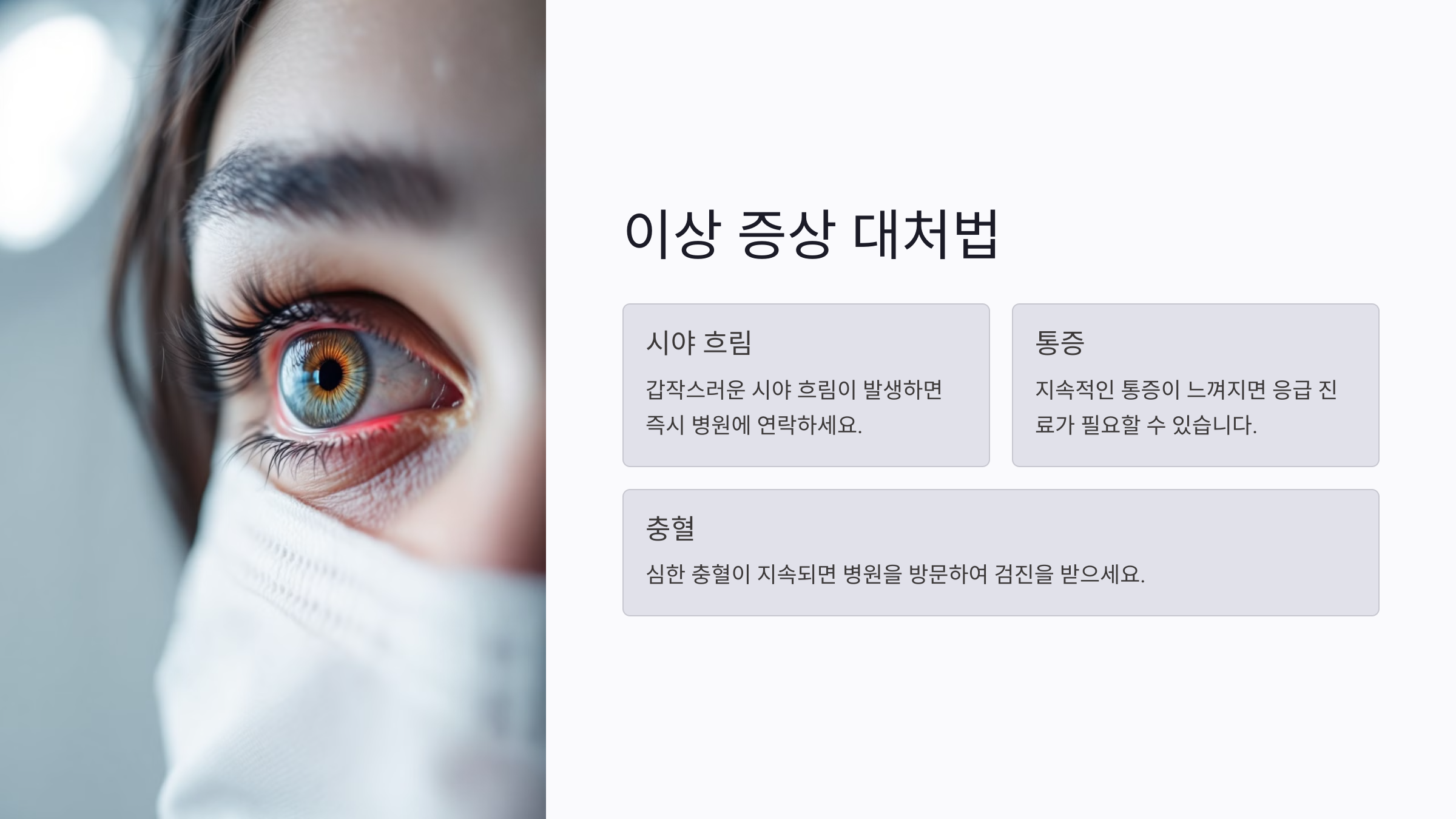4) 이상 증상 대처: 시야가 흐려지거나 통증이 느껴질 경우 바로 병원으로 연락해야 해요. 병원이 어떤 응급 대처 서비스를 제공하는지도 확인해 보세요.