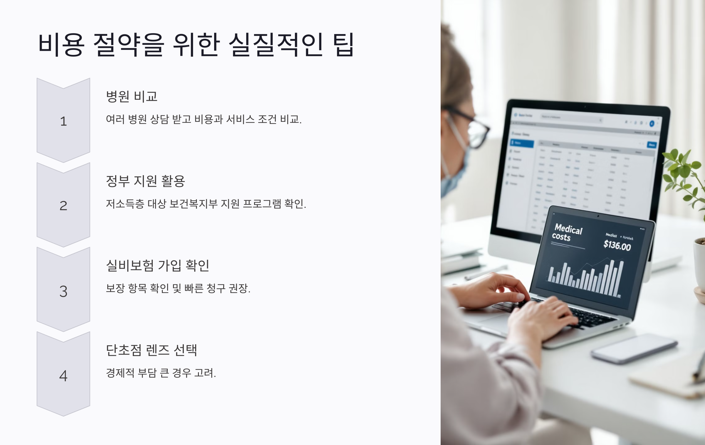 2) 건강보험: 단초점 렌즈와 기본적인 국소 마취, 검사비는 건강보험이 적용돼요. 병원 상담 시 보험 적용 가능 항목을 정확히 물어보세요.