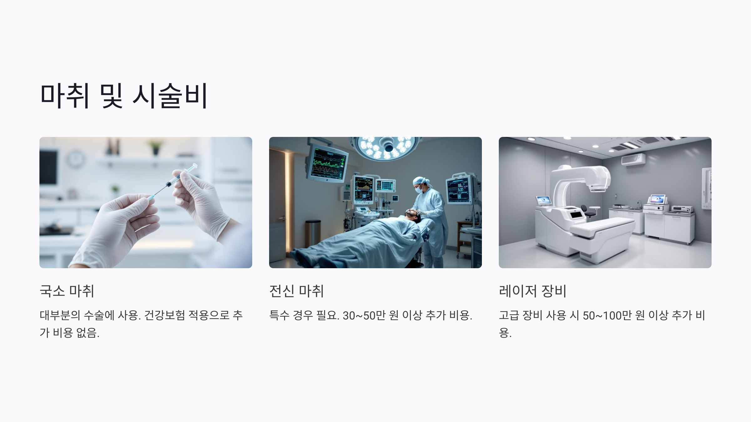 2) 전신 마취: 일부 환자(특히 움직임을 조절하기 어려운 경우)에게는 전신 마취가 필요할 수 있어요. 이 경우 비용이 30만 원에서 50만 원 이상 발생할 수 있어요.