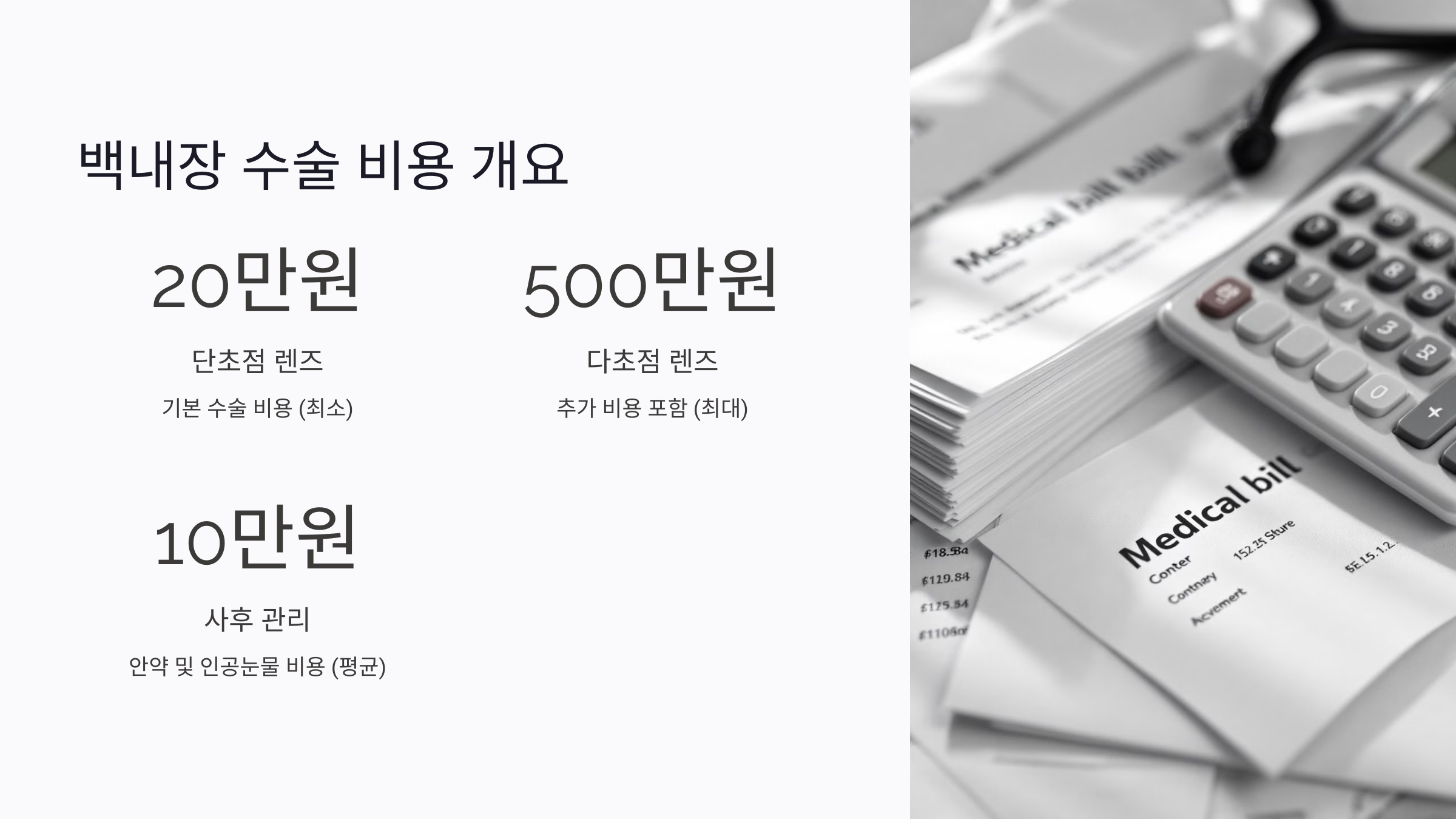 3) 후발성 백내장 시술: 후발성 백내장이 발생할 경우 YAG 레이저 시술이 필요할 수 있어요. 이 시술은 비급여 항목으로 10만 원에서 20만 원 정도의 비용이 발생할 수 있어요.