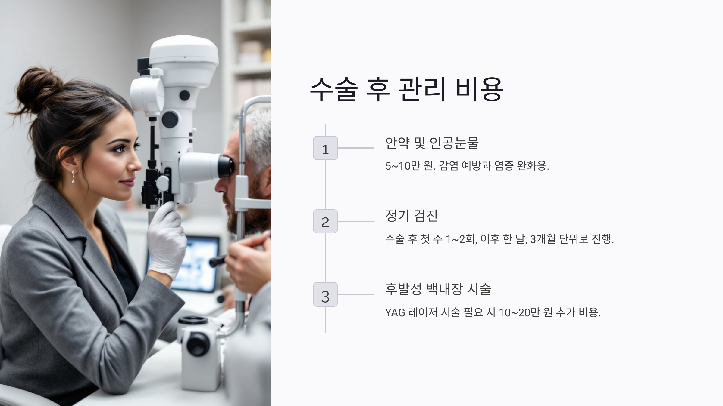 백내장 수술 후에도 일정한 관리와 치료가 필요하며, 이 과정에서 추가 비용이 발생할 수 있어요. 사후 관리 비용은 미리 예산을 고려해 준비하는 것이 좋아요.