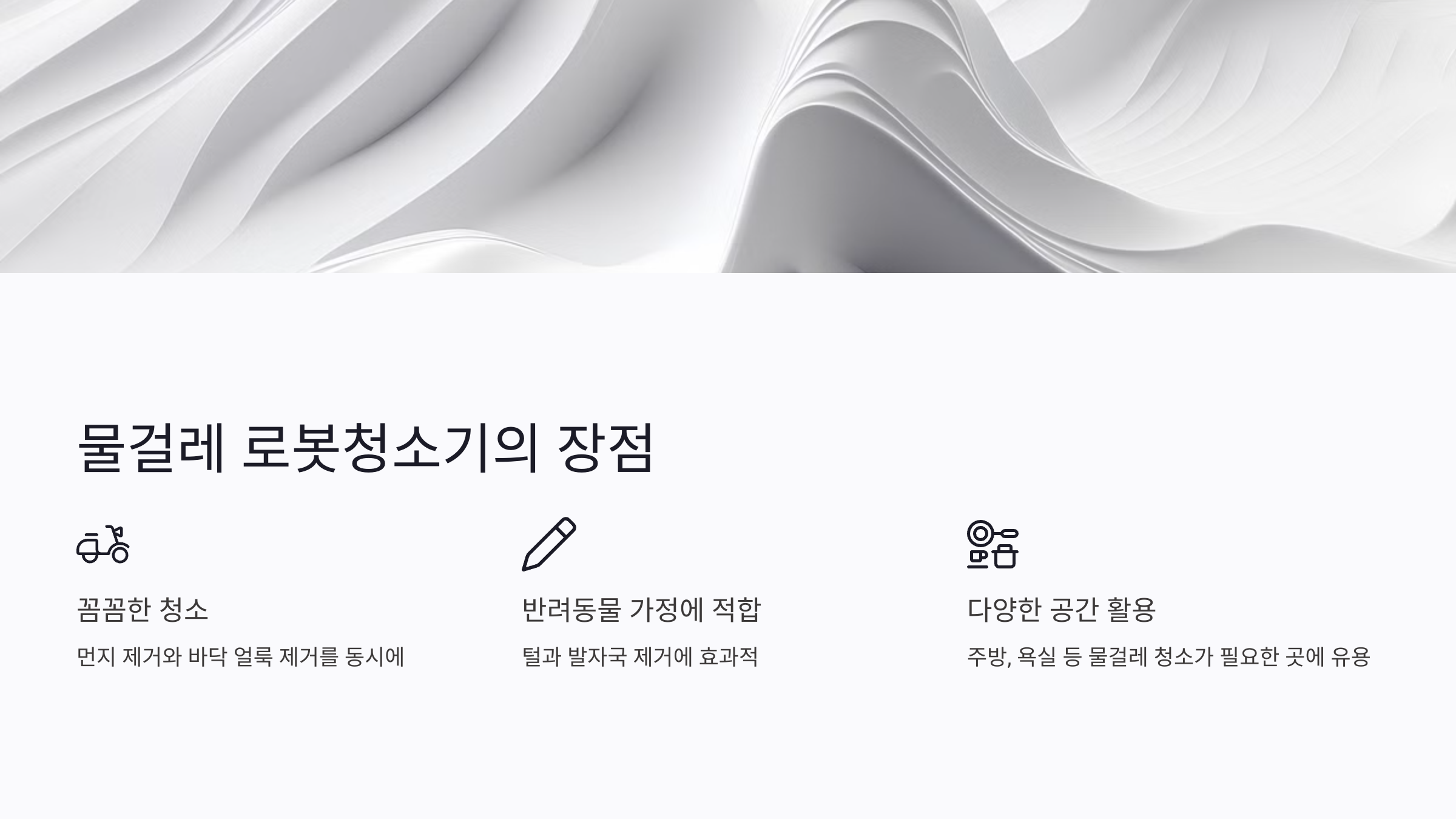 장점으로는 바닥의 오염물질을 효과적으로 제거할 수 있고, 주방이나 욕실처럼 물걸레 청소가 필요한 공간에서도 매우 유용하다는 점을 들 수 있어요. 특히 반려동물을 키우는 가정에서는 물걸레 청소기가 털과 발자국 등을 제거하는 데 큰 도움이 된답니다.
