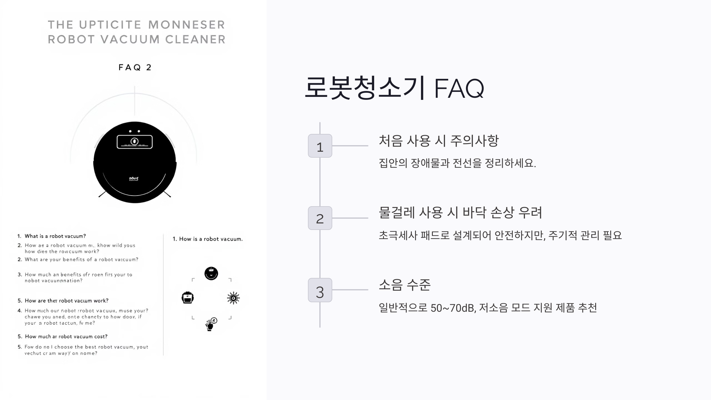 A3. 일반적으로 로봇청소기의 소음은 50~70dB 정도로, 일반 진공청소기보다 조용해요. 저소음 모드를 지원하는 제품을 선택하면 더욱 쾌적하게 사용할 수 있어요.