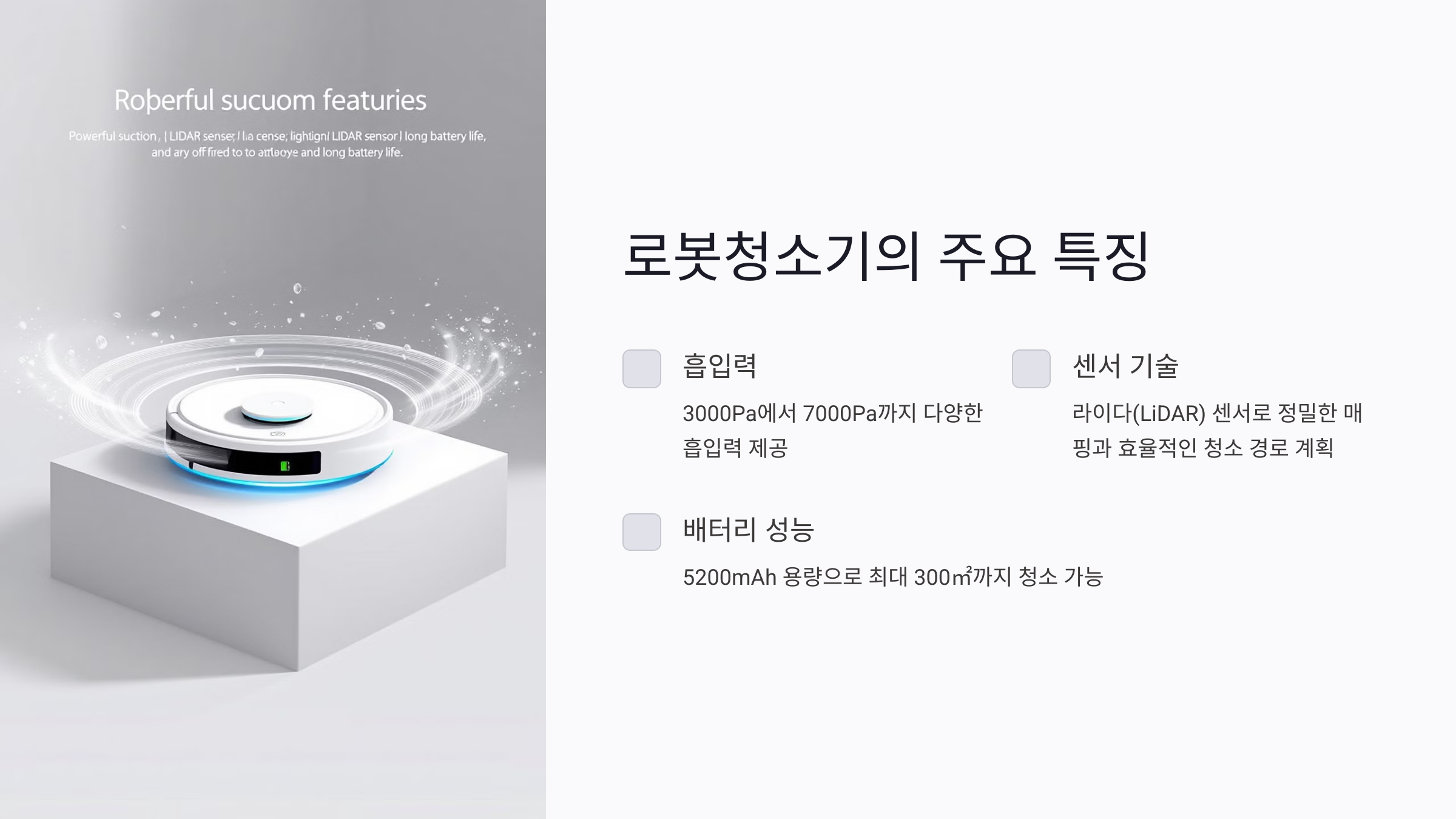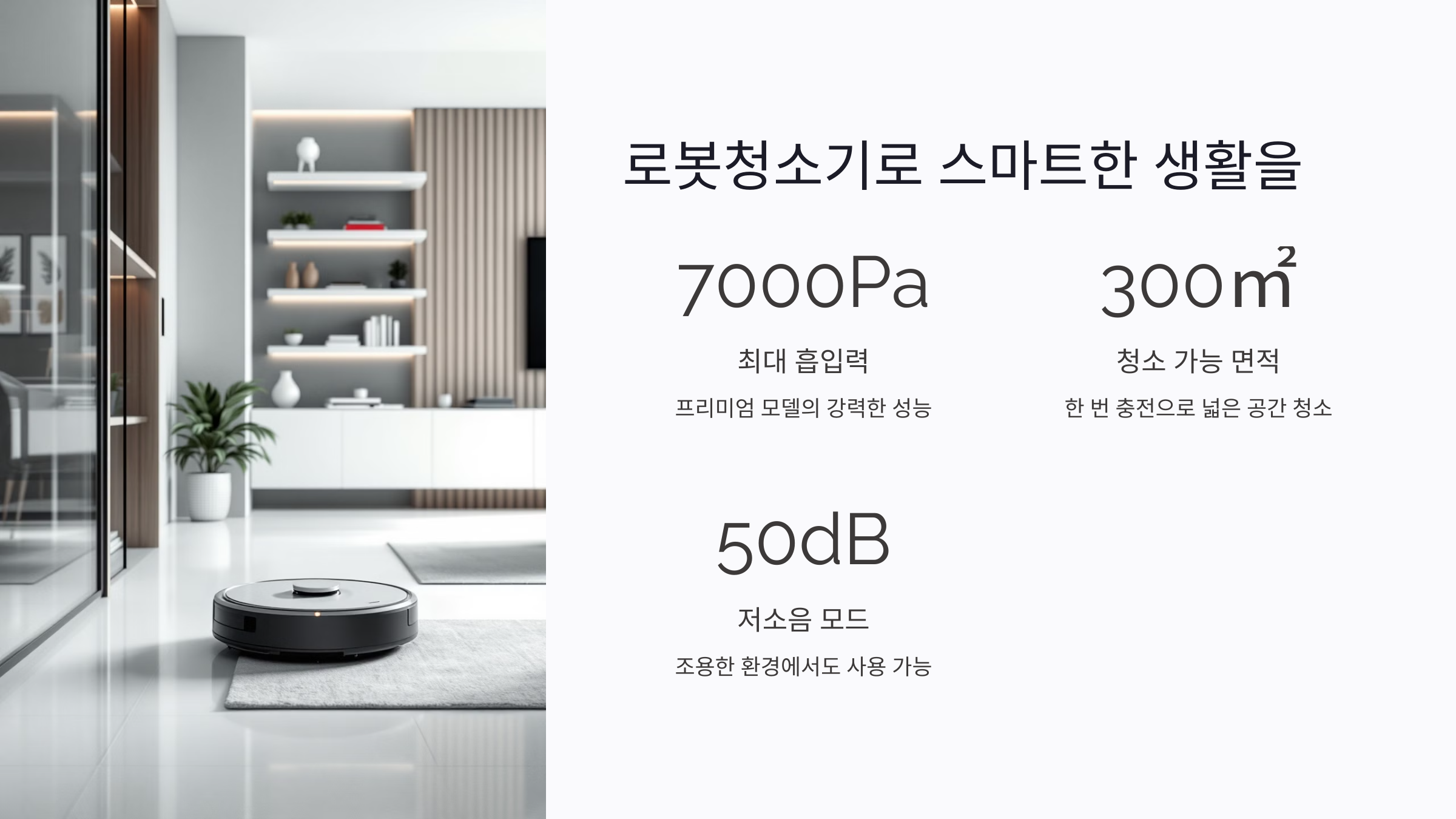 로봇청소기를 선택할 때 가장 먼저 확인해야 할 것은 흡입력, 센서 기술, 배터리 성능, 그리고 물걸레 기능 여부예요. 특히 흡입력은 로봇청소기의 성능을 결정짓는 중요한 요소 중 하나인데, 제품에 따라 최대 3000Pa에서 7000Pa까지 다양하게 제공되고 있어요.