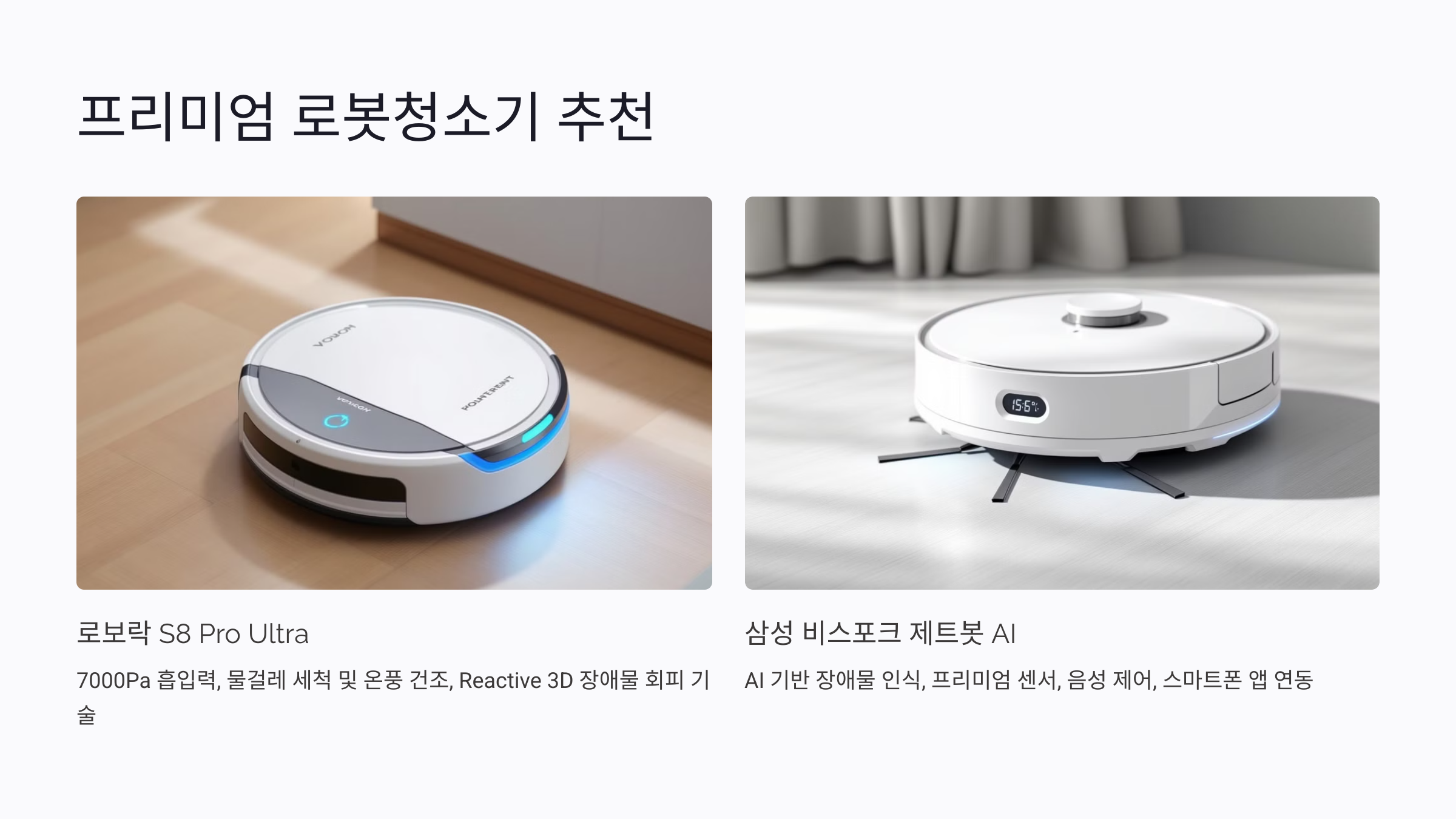 프리미엄 로봇청소기는 강력한 흡입력과 첨단 기술로 청소를 더욱 효율적이고 편리하게 만들어줘요. 대표적으로 로보락 S8 Pro Ultra와 삼성 비스포크 제트봇 AI는 최신 기술과 고급스러운 디자인을 모두 갖춘 제품이에요.