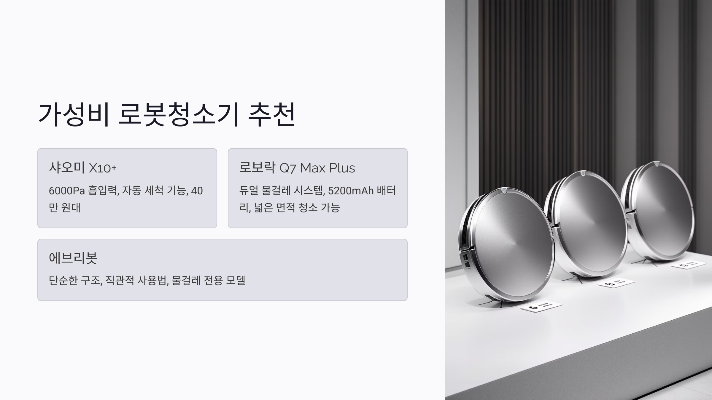 여기서는 로봇청소기의 주요 성능 비교와 함께 물걸레 로봇청소기의 장단점, 그리고 가성비 모델부터 프리미엄 라인까지 상황에 맞는 제품 추천을 도와줄게요. 구매를 고려하는 분들이라면, 이 가이드를 통해 로봇청소기를 선택하는 데 큰 도움을 받을 수 있을 거예요.