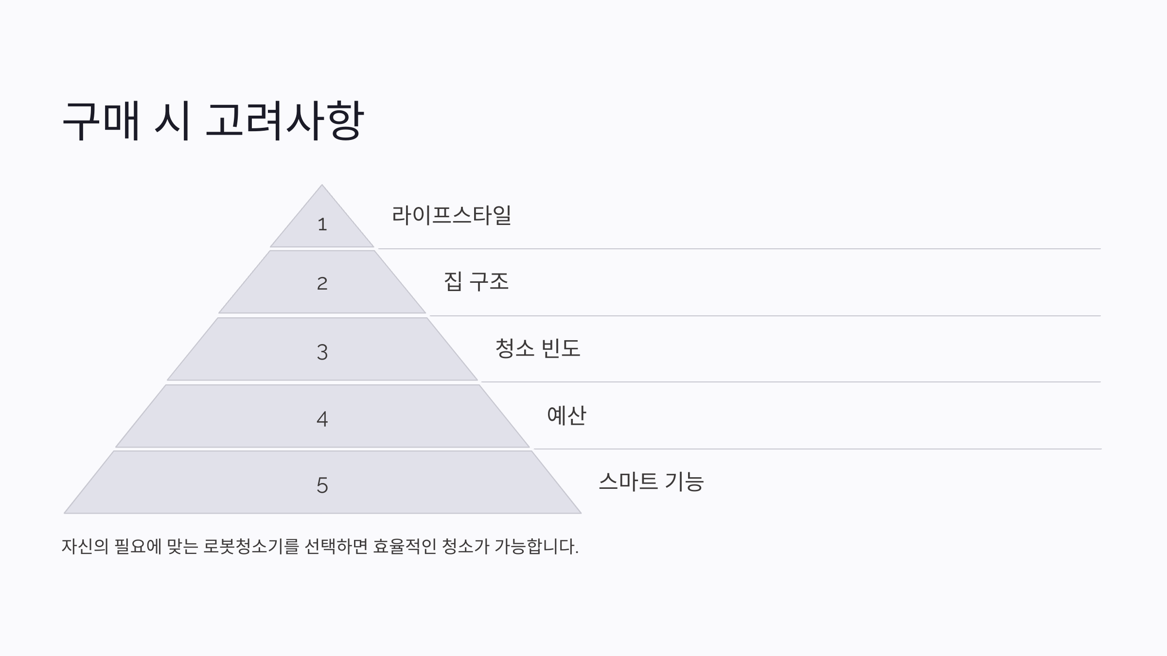 로봇청소기를 구매하기 전에 자신의 라이프스타일과 집 구조를 고려하는 것이 중요해요. 넓은 집에는 배터리 수명이 긴 모델이 적합하고, 반려동물이 있는 경우에는 장애물 감지 및 털 제거 성능이 뛰어난 제품을 추천해요.