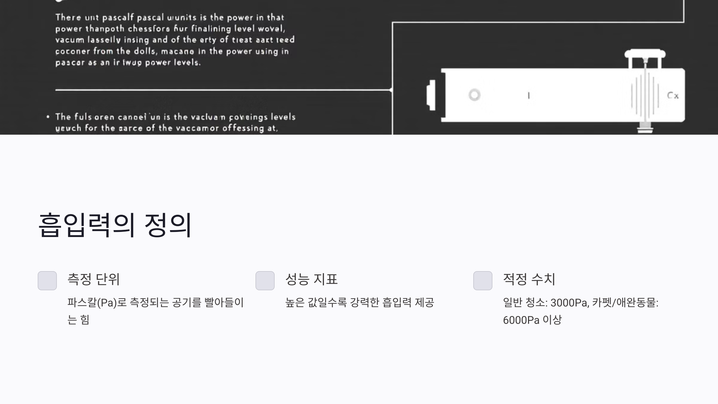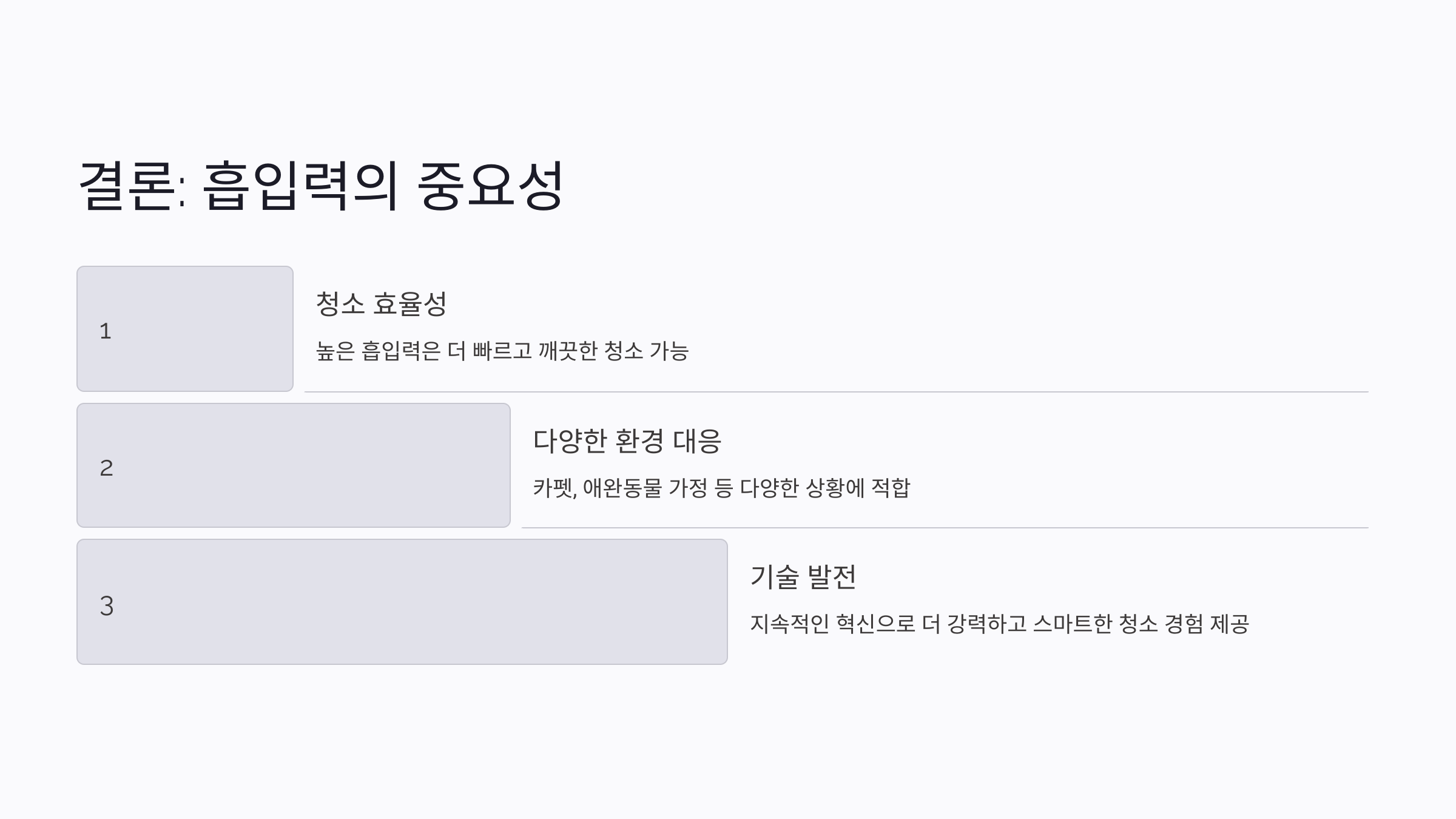 흡입력은 로봇청소기의 전반적인 청소 성능을 좌우하는 요소로, 다양한 환경에서 얼마나 효과적으로 먼지와 이물질을 제거할 수 있는지에 직접적인 영향을 미쳐요. 예를 들어, 카펫 깊숙이 박힌 먼지나 털을 제거하려면 강력한 흡입력이 필수적이에요.