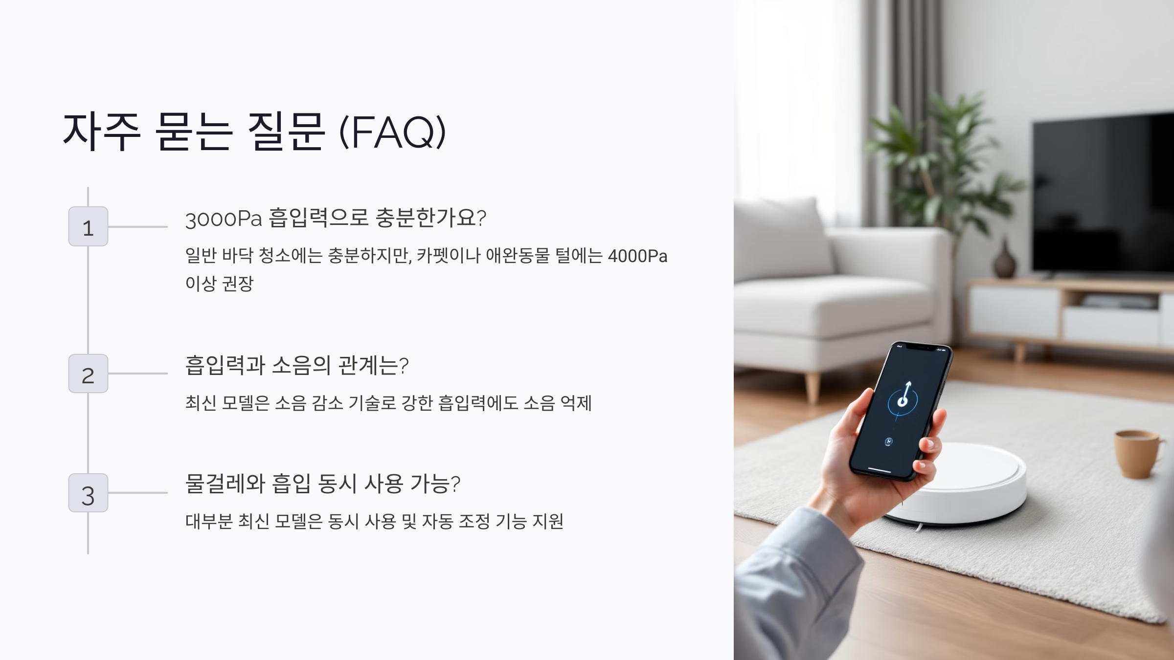 A1. 일반적인 바닥 청소에는 3000Pa도 충분하지만, 카펫 청소나 애완동물 털 제거에는 4000Pa 이상의 흡입력이 권장돼요.