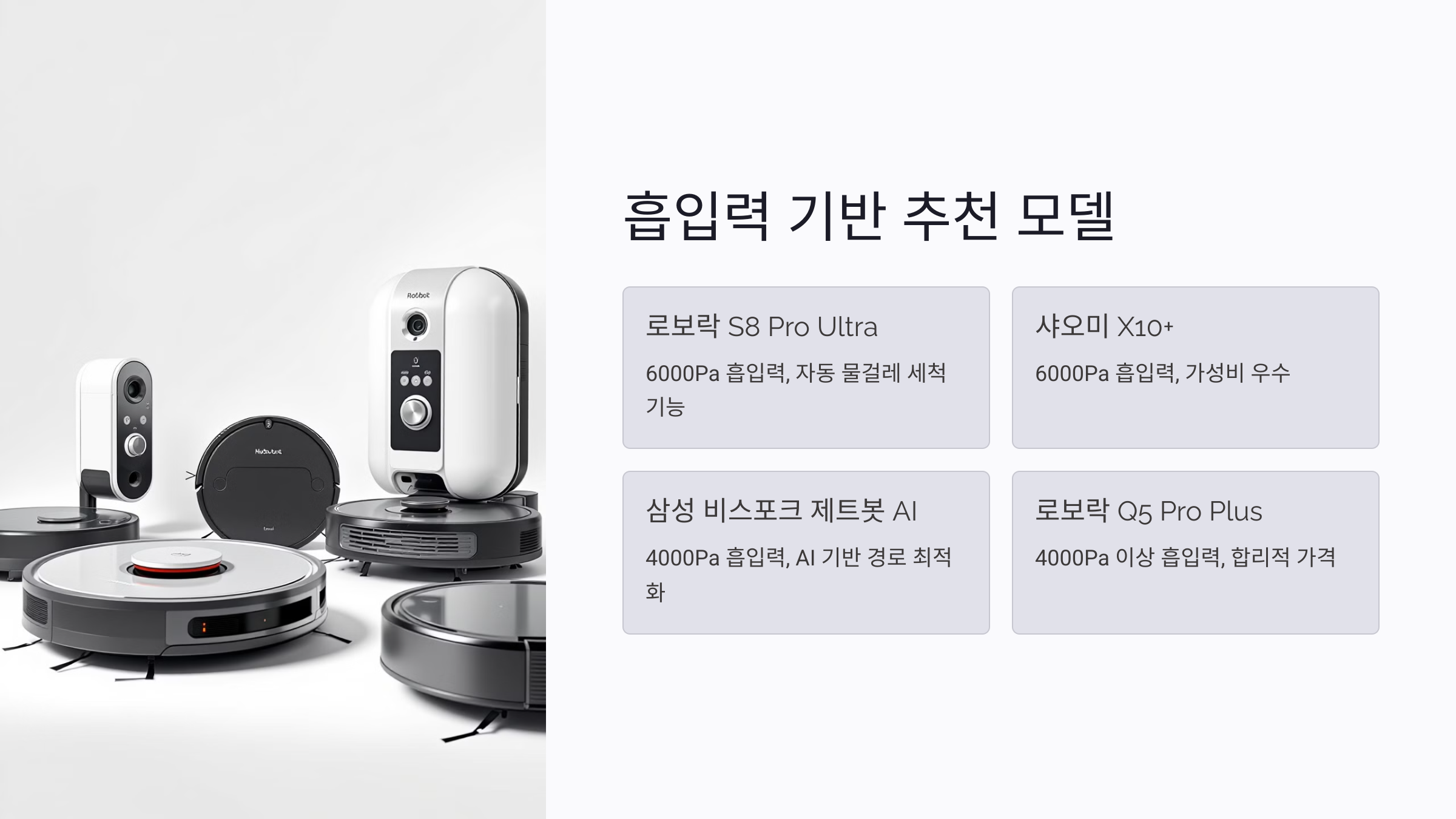 로봇청소기 시장에는 다양한 흡입력을 가진 모델들이 있어요. 각 모델별 흡입력을 비교해 보면서 어떤 제품이 사용자에게 적합한지 알아볼게요.