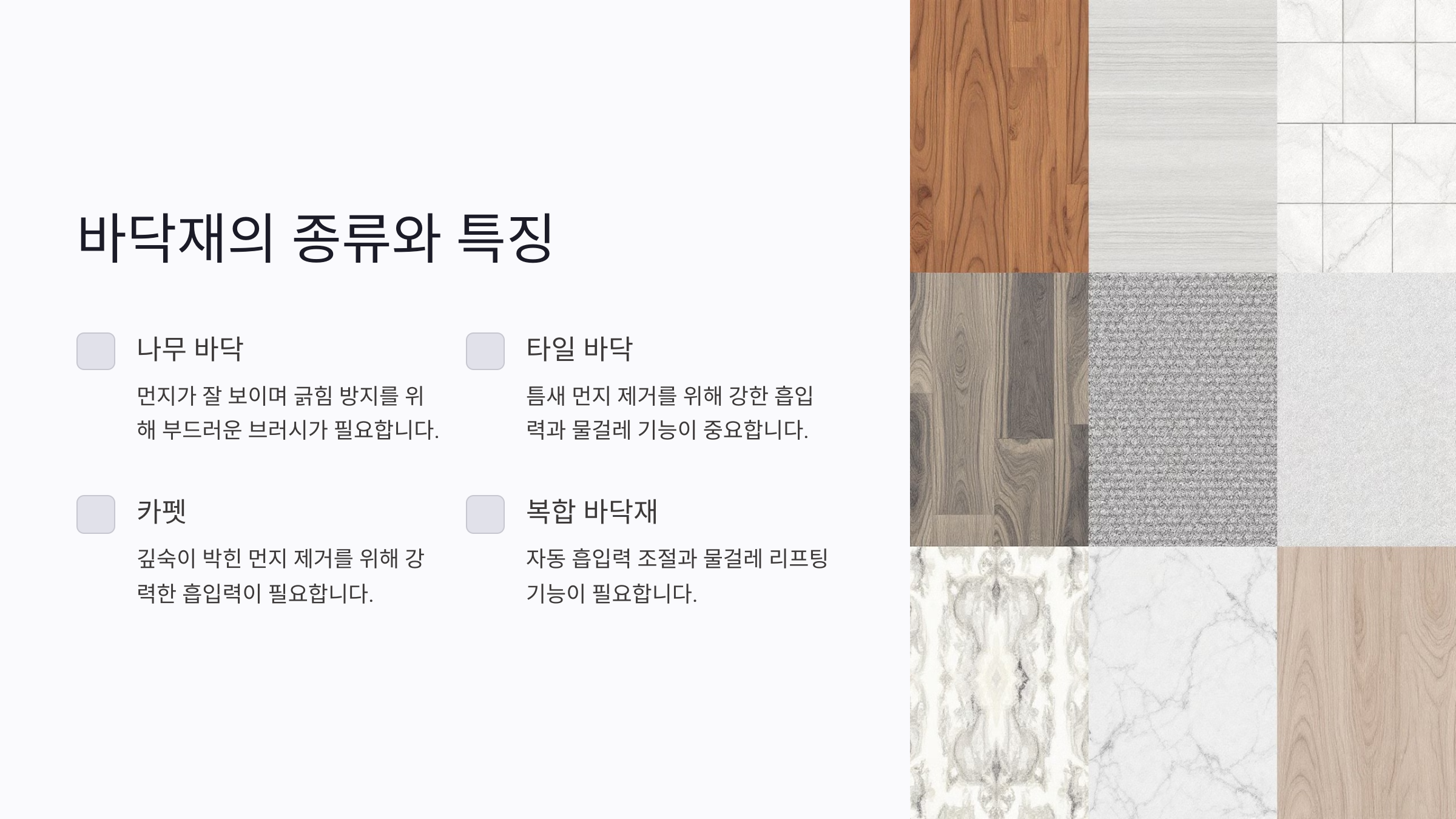 가정에서 흔히 사용되는 바닥재는 나무 바닥, 타일, 카펫, 그리고 이 둘 이상이 혼합된 복합 바닥재로 나뉘어요. 각각의 바닥재는 청소 시 요구되는 기술과 성능이 다르답니다.