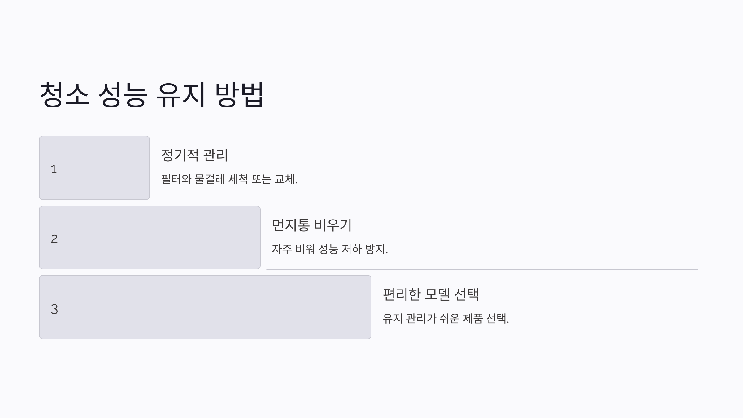 A6. 정기적으로 필터와 물걸레를 세척하거나 교체하고, 먼지통을 자주 비우는 것이 중요해요. 유지 관리가 편리한 모델을 선택하면 이런 작업이 더 쉬워져요.