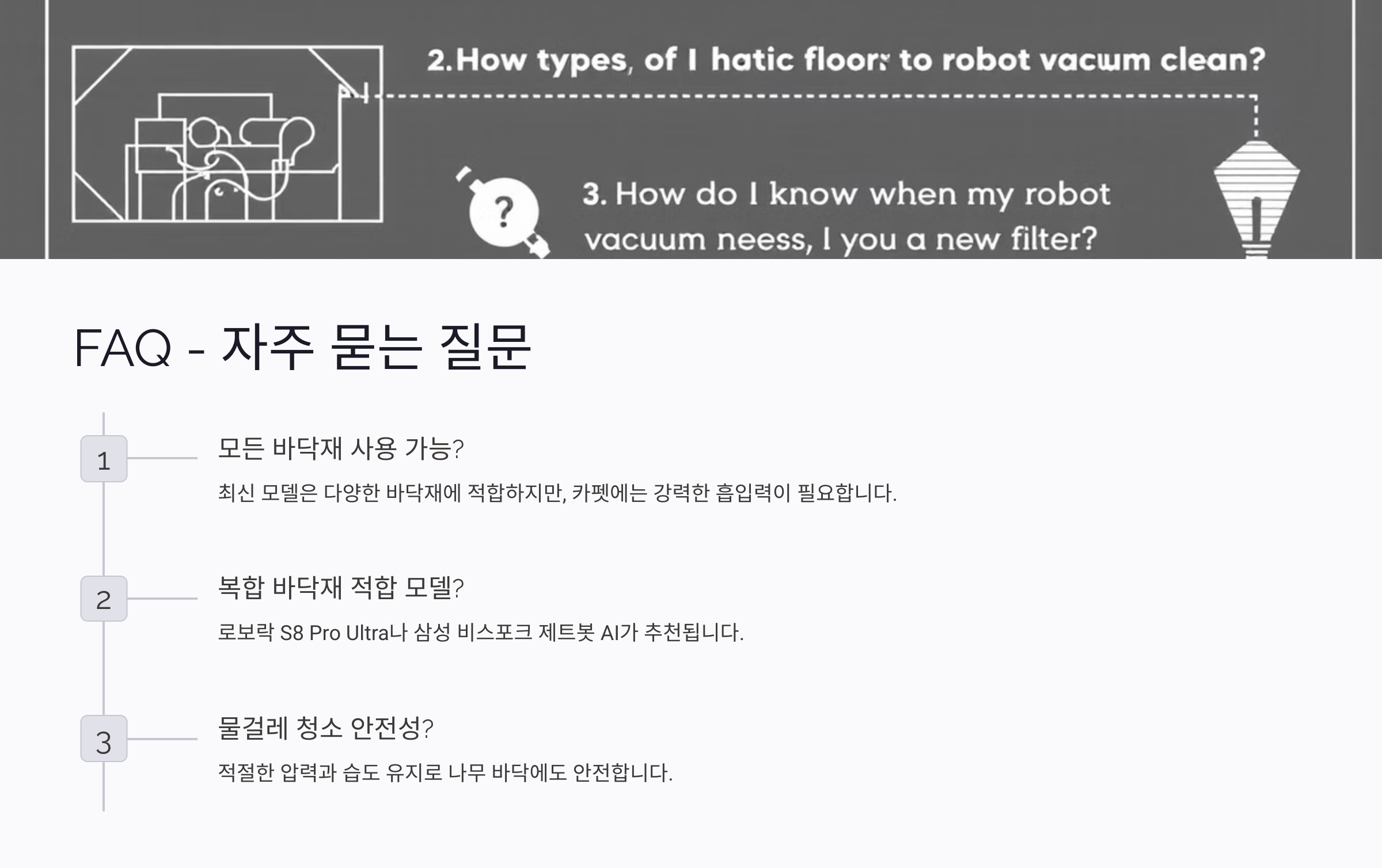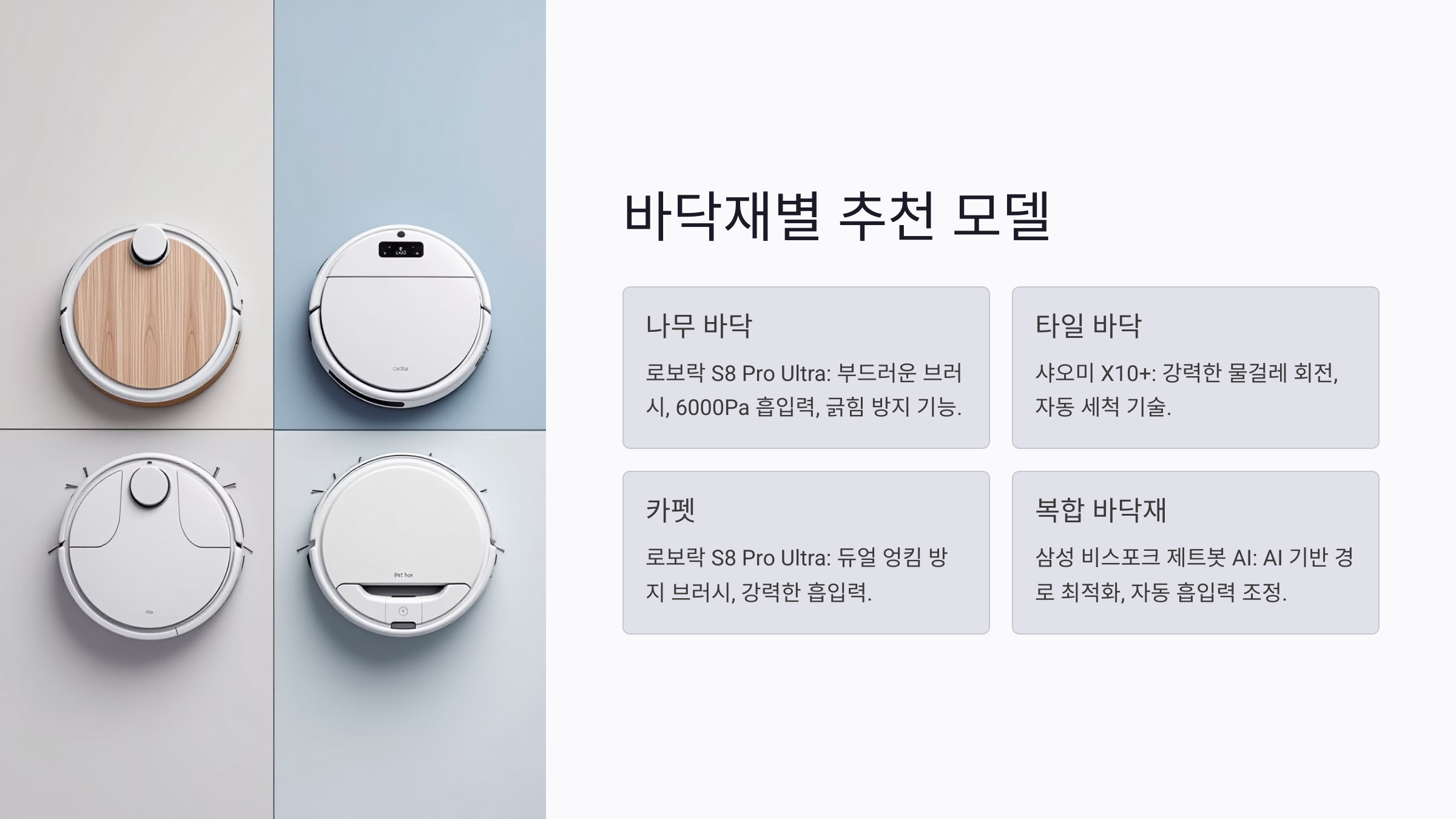 A2. 복합 바닥재에서는 흡입력 자동 조정과 물걸레 리프팅 기능을 제공하는 로보락 S8 Pro Ultra나 삼성 비스포크 제트봇 AI를 추천해요.
