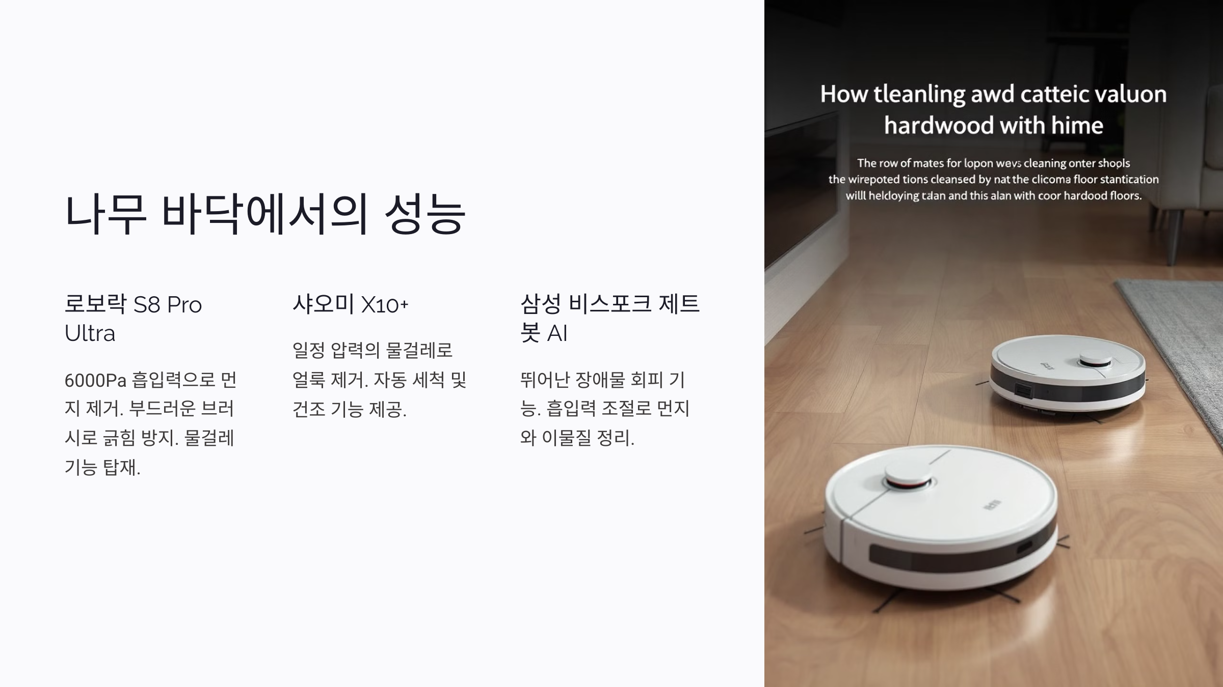 A3. 물걸레 기능이 탑재된 모델은 적절한 압력과 습도를 유지해 나무 바닥에도 안전해요. 샤오미 X10+처럼 물걸레 자동 관리 기능이 있는 모델을 선택하면 더욱 좋아요.