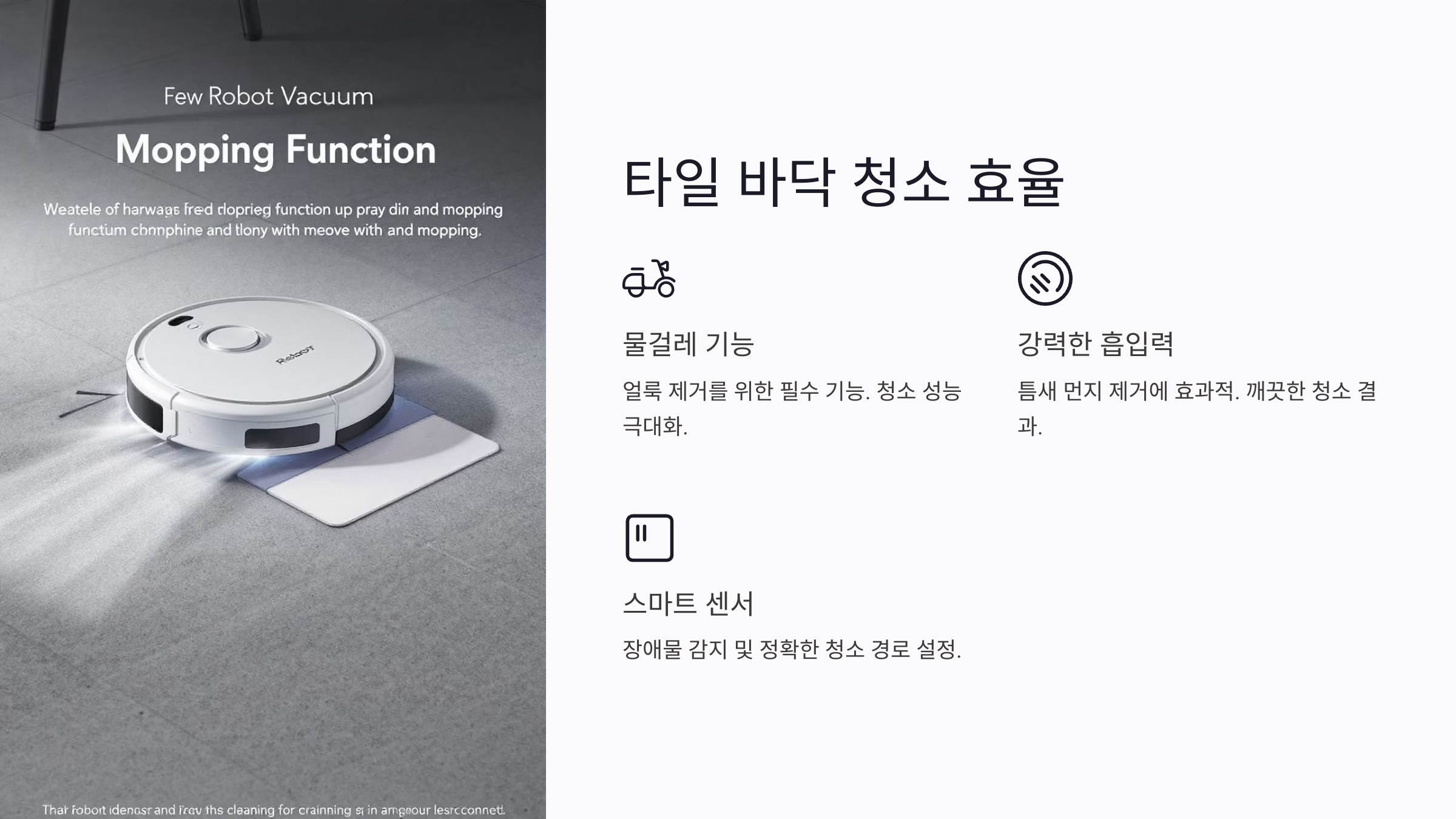 2. 타일 바닥은 틈새에 먼지가 끼는 경우가 많아 강한 흡입력과 물걸레 기능이 유용해요. 얼룩 제거도 중요한 요소랍니다.