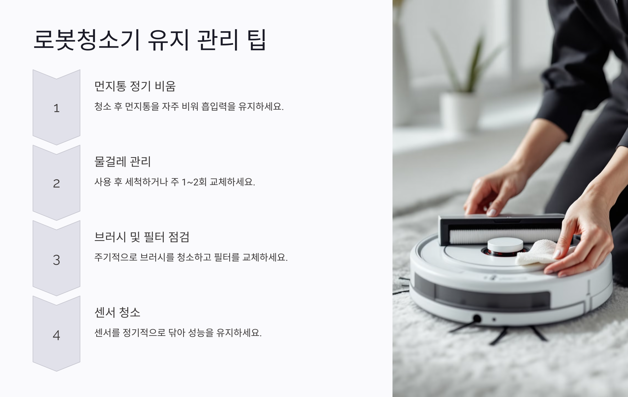 로봇청소기를 오랫동안 효율적으로 사용하려면 정기적인 관리가 중요해요. 아래는 유지 관리를 위한 팁이에요: