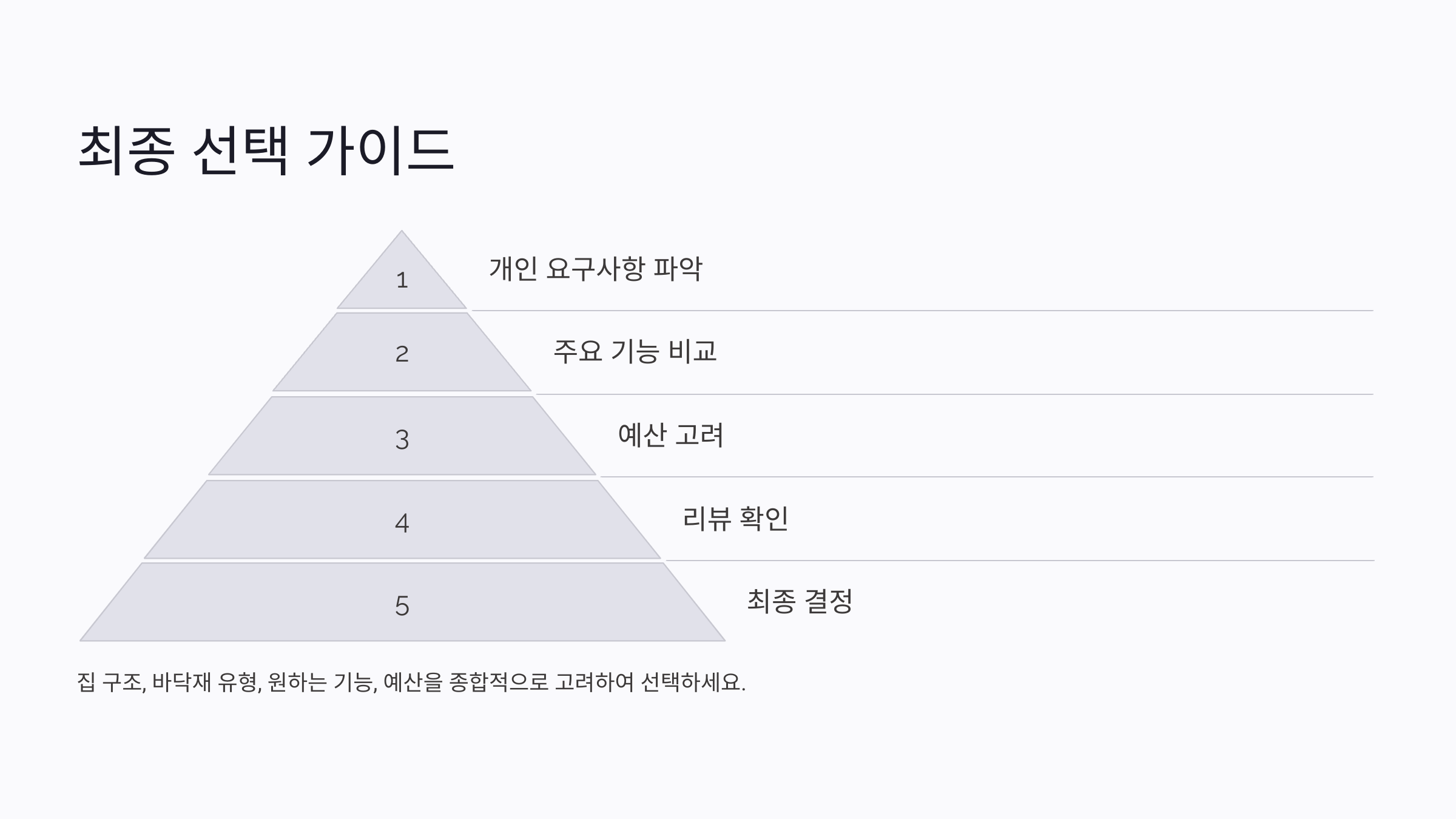 로봇청소기를 선택할 때는 집 구조, 바닥재 유형, 예산, 원하는 기능 등을 종합적으로 고려해야 해요. 아래는 선택 시 중요한 기준들이에요: